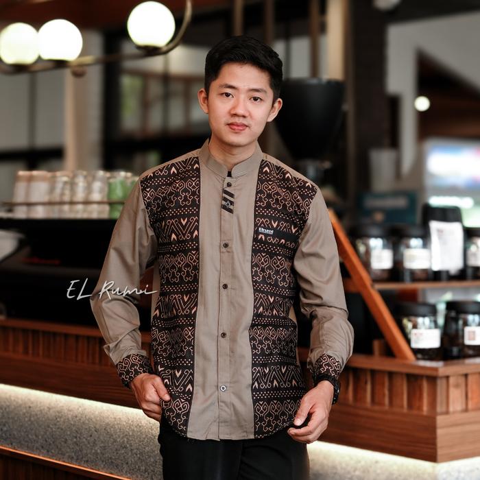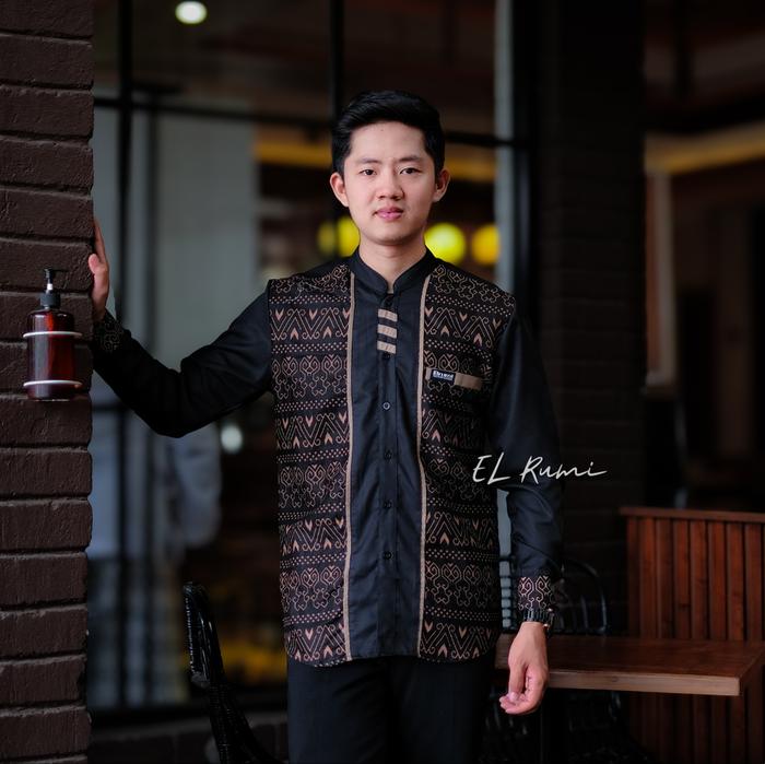 [Star] Baju Koko Lengan Panjang Motif Jari Lis Batik Elrumi Muslim Pria Dewasa Katun Hitam Kombinasi - putih, S