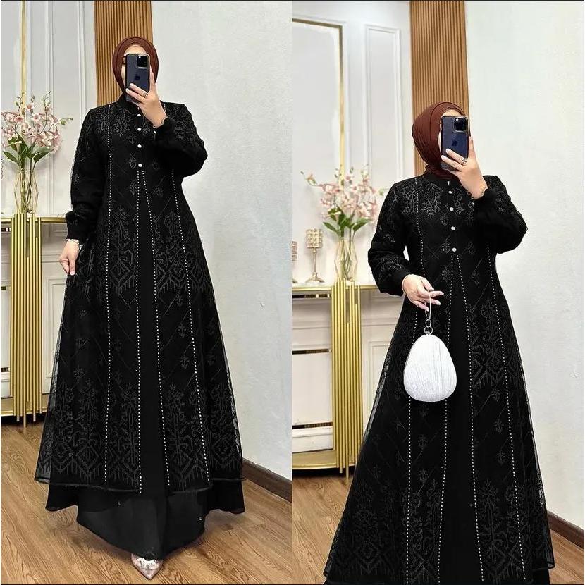 Gamis Brukat Mewah Denara Dress Bahan Ceruty Babydoll Mix Sworoski Warna Burgundy Gamis Melayu