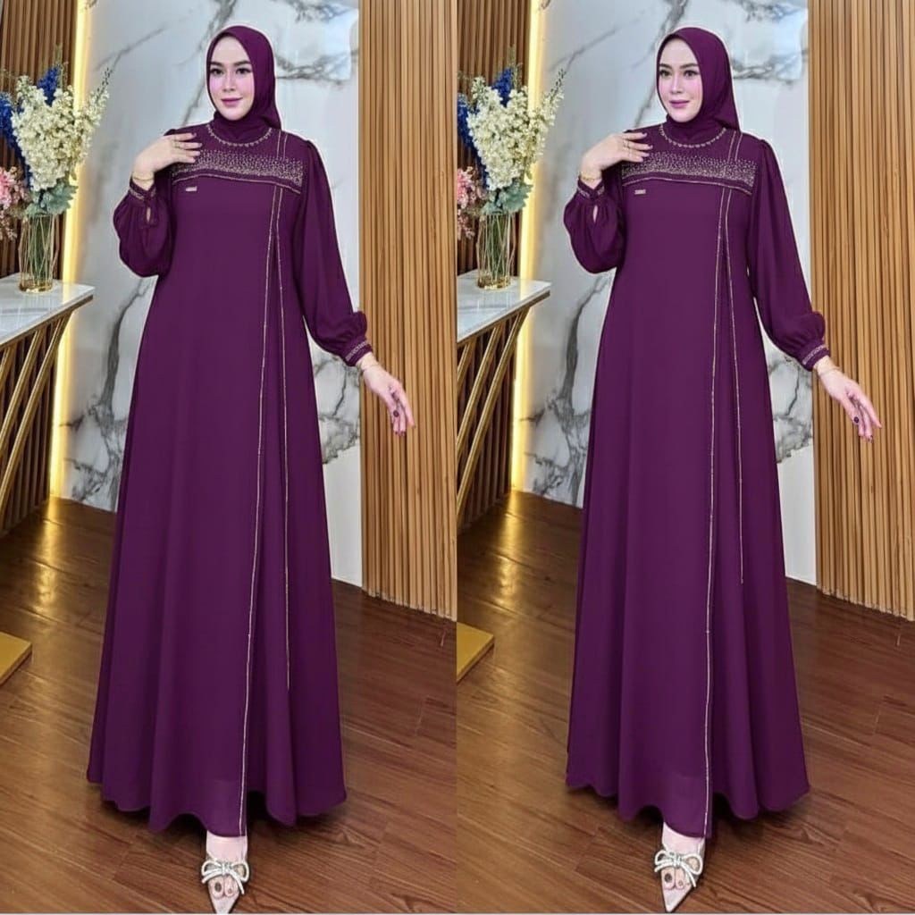 Gamis Abaya Karina Dua Layer Bahan Ceruty Motif Swarovski Mewah Elegan Terbaru // Gamis Lebaran Wanita 2026 Warna Mahoga