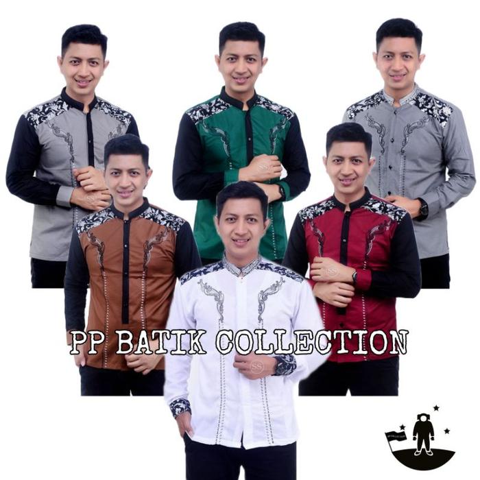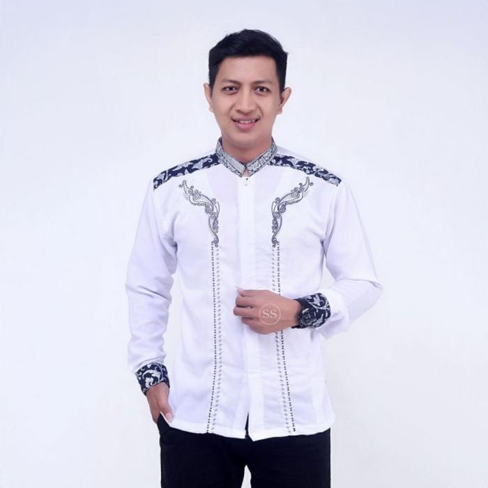 [Star] Baju Muslim Pria Modern Motif Batik Kombinasi Bordir Lengan Panjang Dewasa - Padi Putih, M