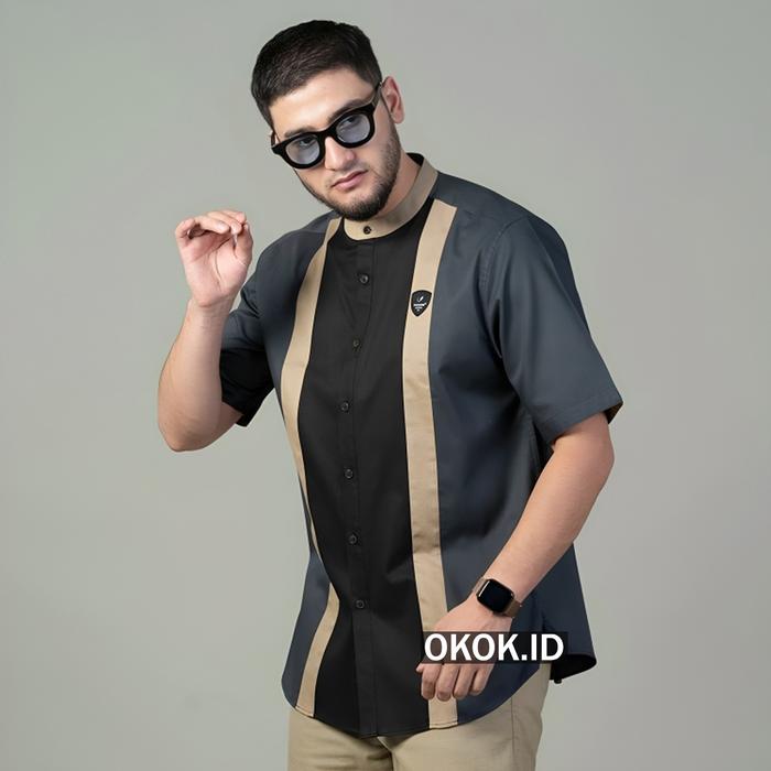 [Star] Baju Koko Pria Polos Kombinasi lengan pendek kerah sanghai Original Ukuran M L XL XXL Muslim Dewasa Kurta Katun -