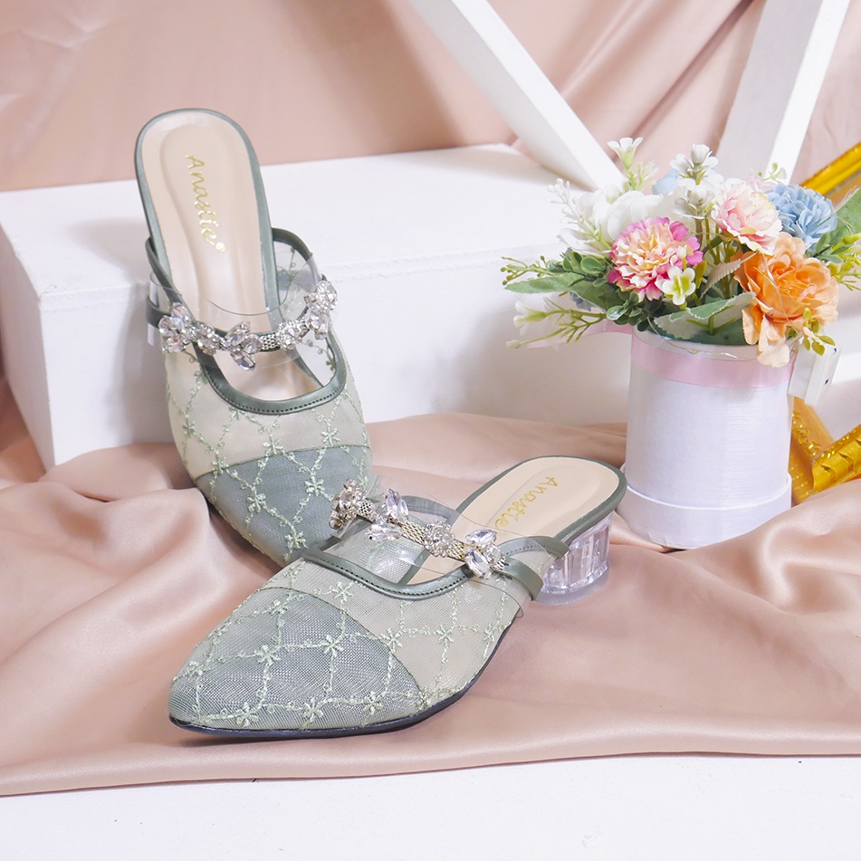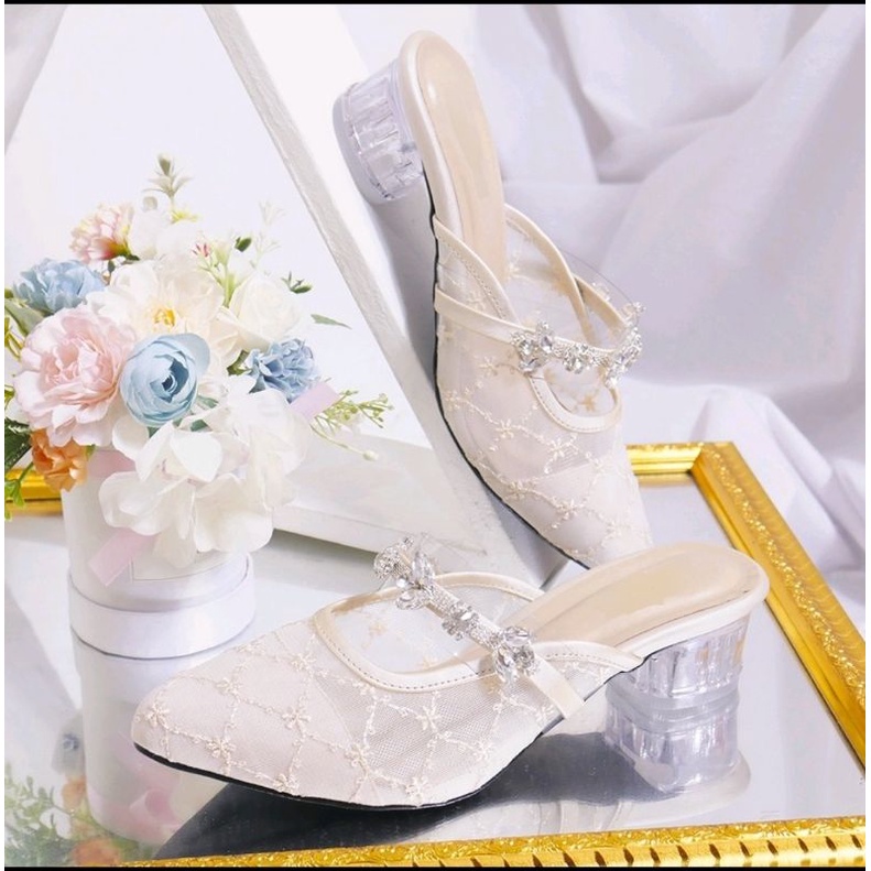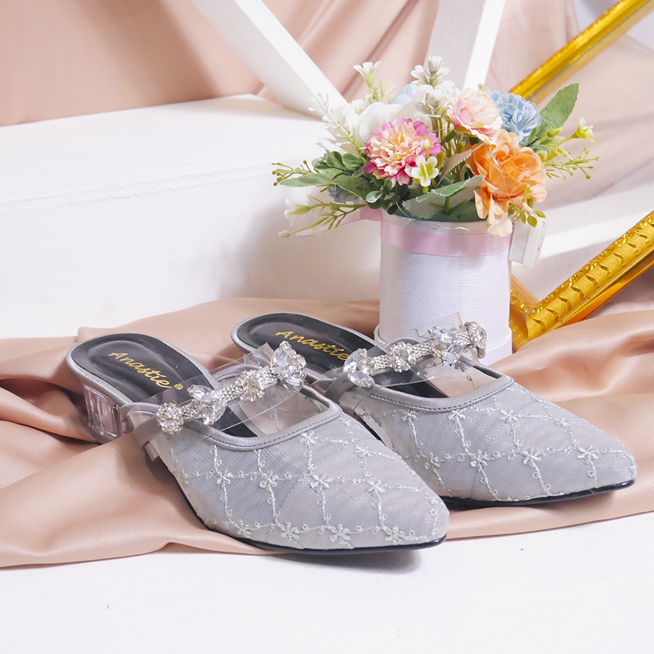 Anastie Amelia - Sendal Wanita | Sendal Pesta | Heels | Hak kaca 3cm | Mutiara | Brukat | Sendal Wanita Kekinian