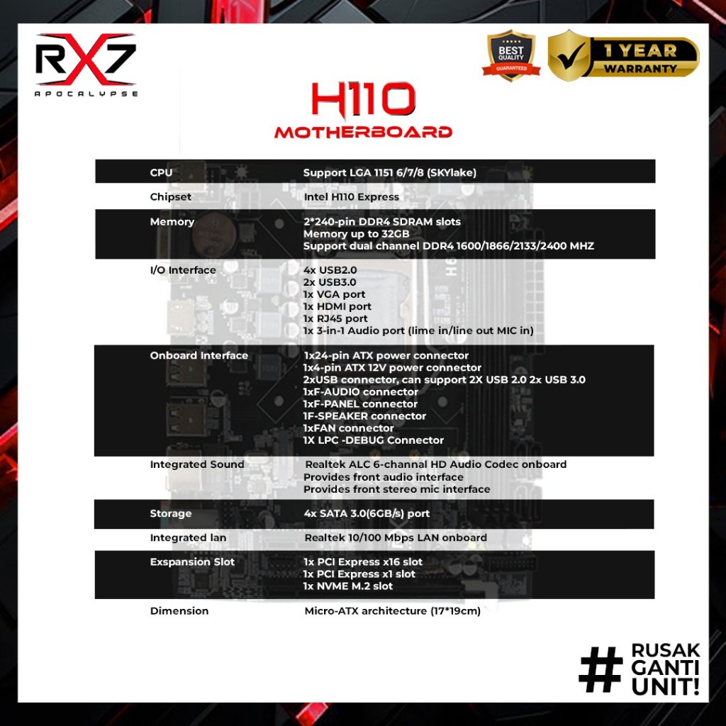 Motherboard Rx7 H110 Socket Lga 1151 Ddr4 Mainboard H110 Intel