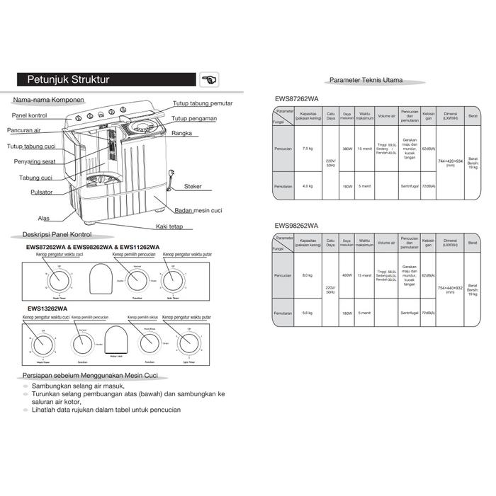 MESIN CUCI 2 TABUNG ELECTROLUX 12KG EWS13262WA / EWS-13262WA BODY FIBER ABS