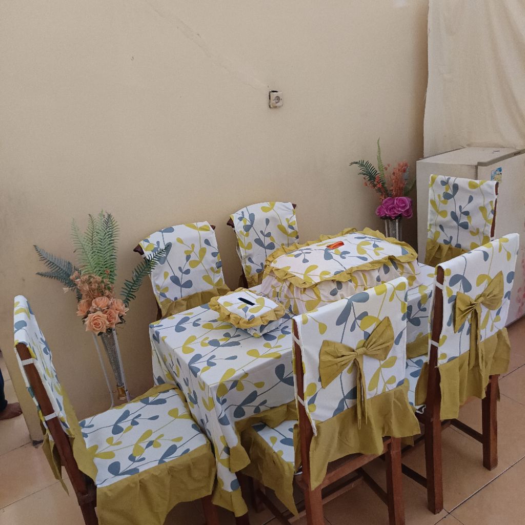 TAPLAK MEJA + SARUNG DINING SET 6 KURSI + TUDUNG SAJI DAUN PAKU-PAKUAN