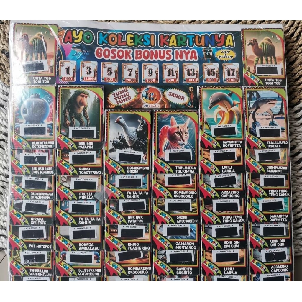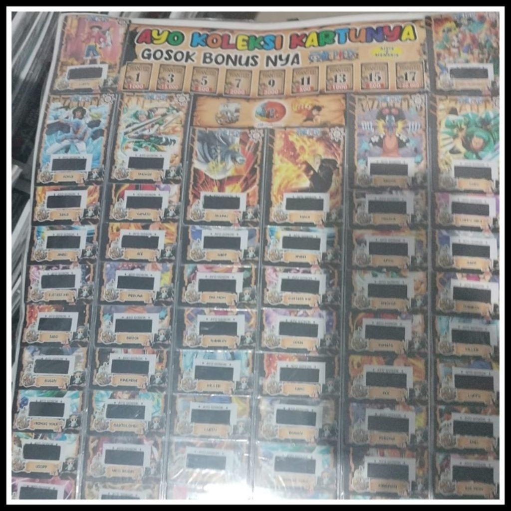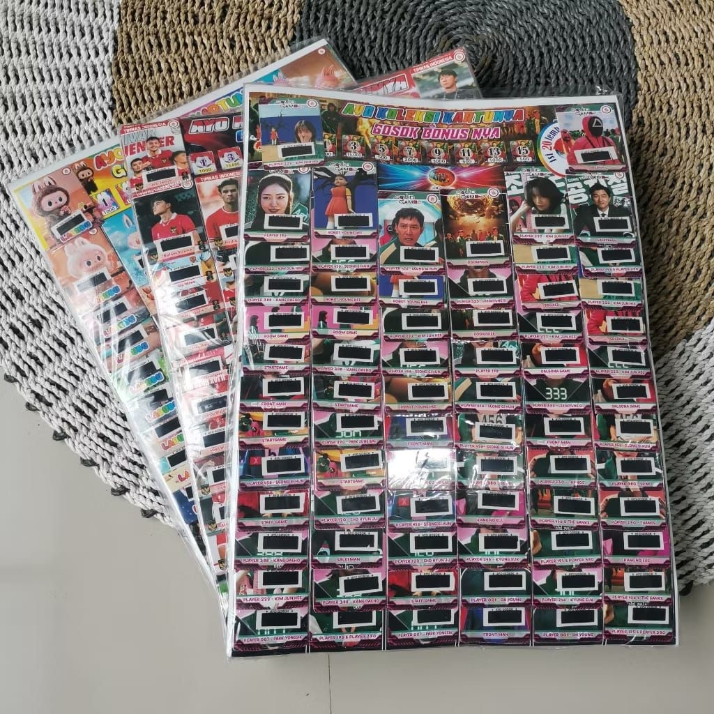 KARTU GOSOKAN BERHADIAH BERGAMBAR TIMNAS / TUNGTUNG SAHUR / PERSIB / ONE PICE 1 LEMBAR iSI 72 PCS KARTU TERBARU Murah Gr
