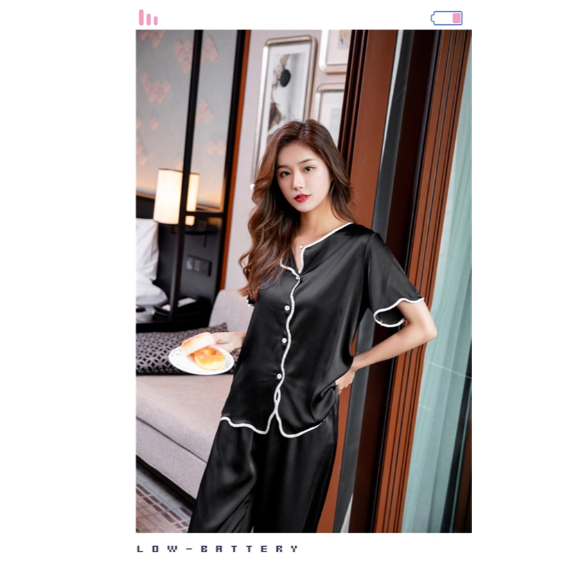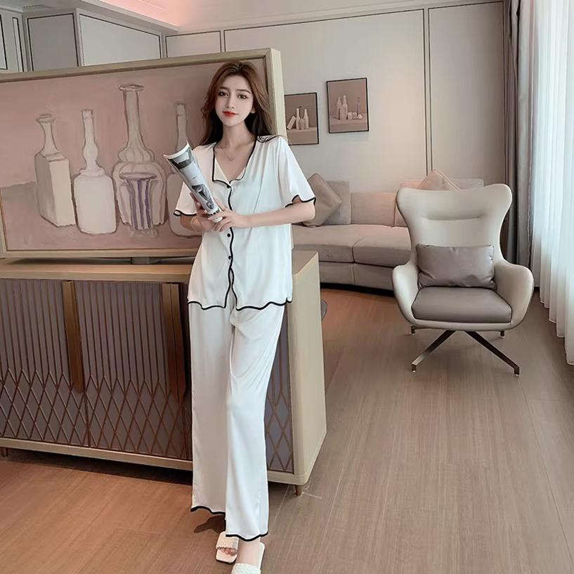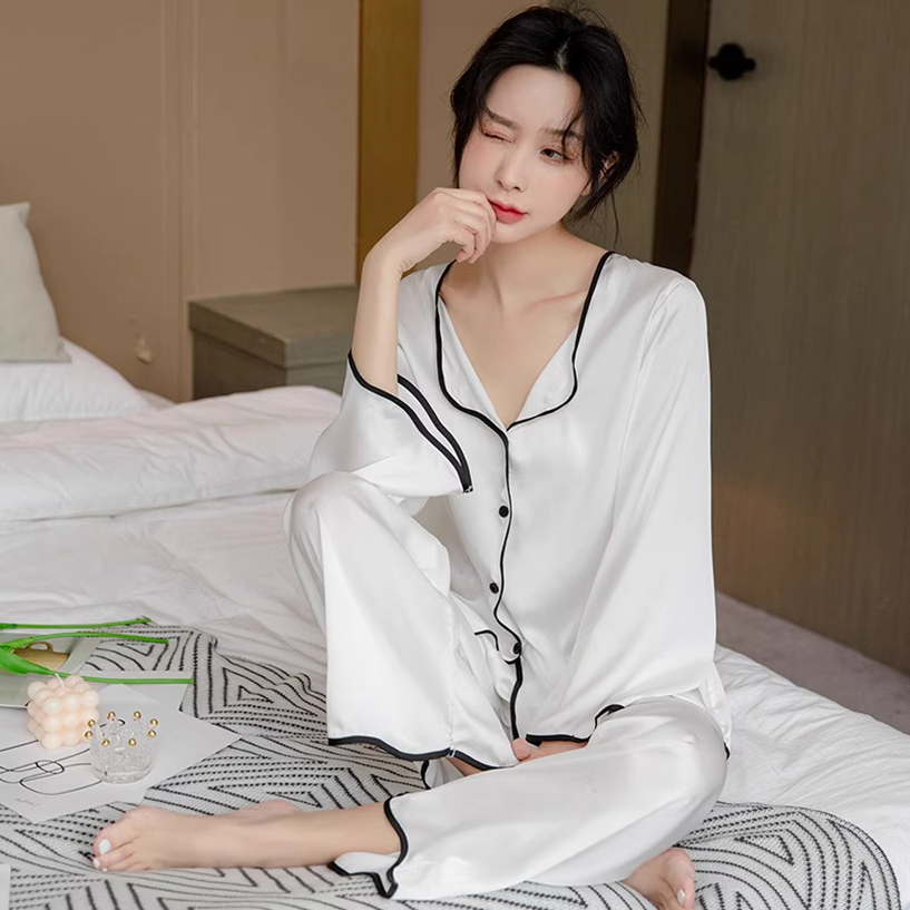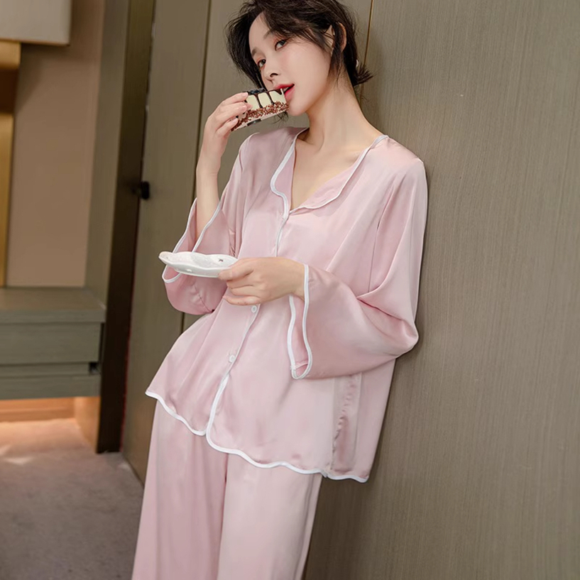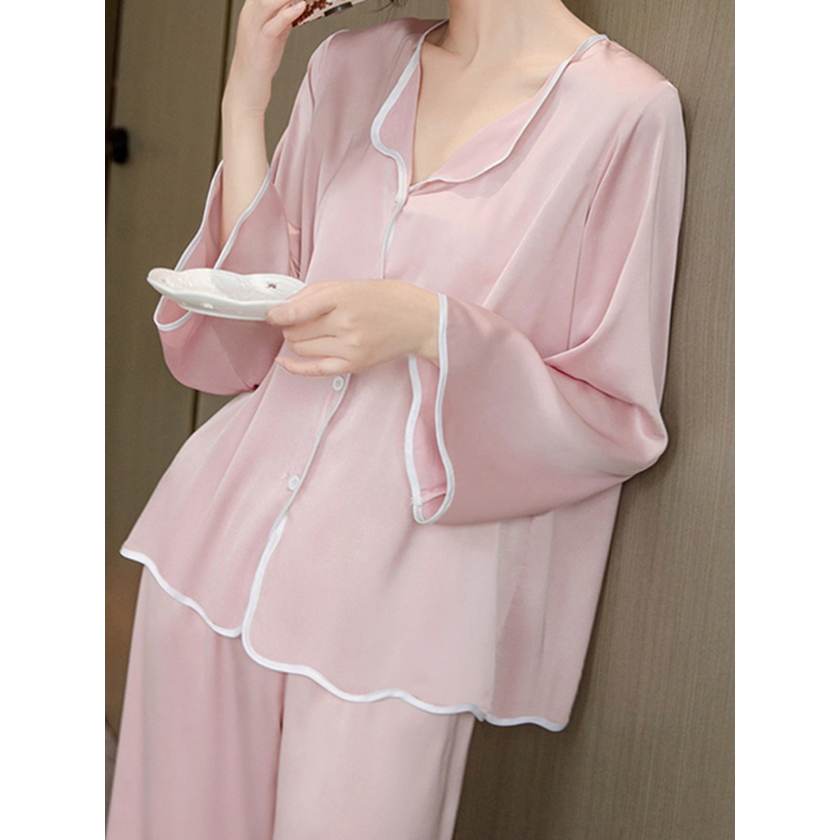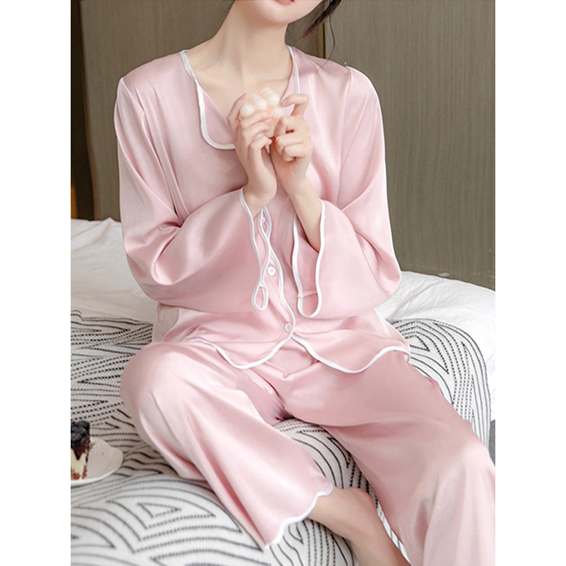 Piyama Wanita Ice Silk Polos Elegan Tepi Gelombang piyama wanita lengan panjang korea Nyaman Dipakai kekinian pink lucu