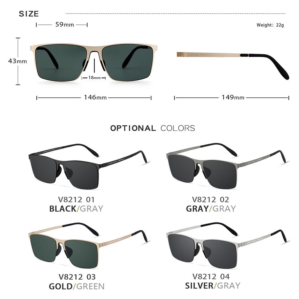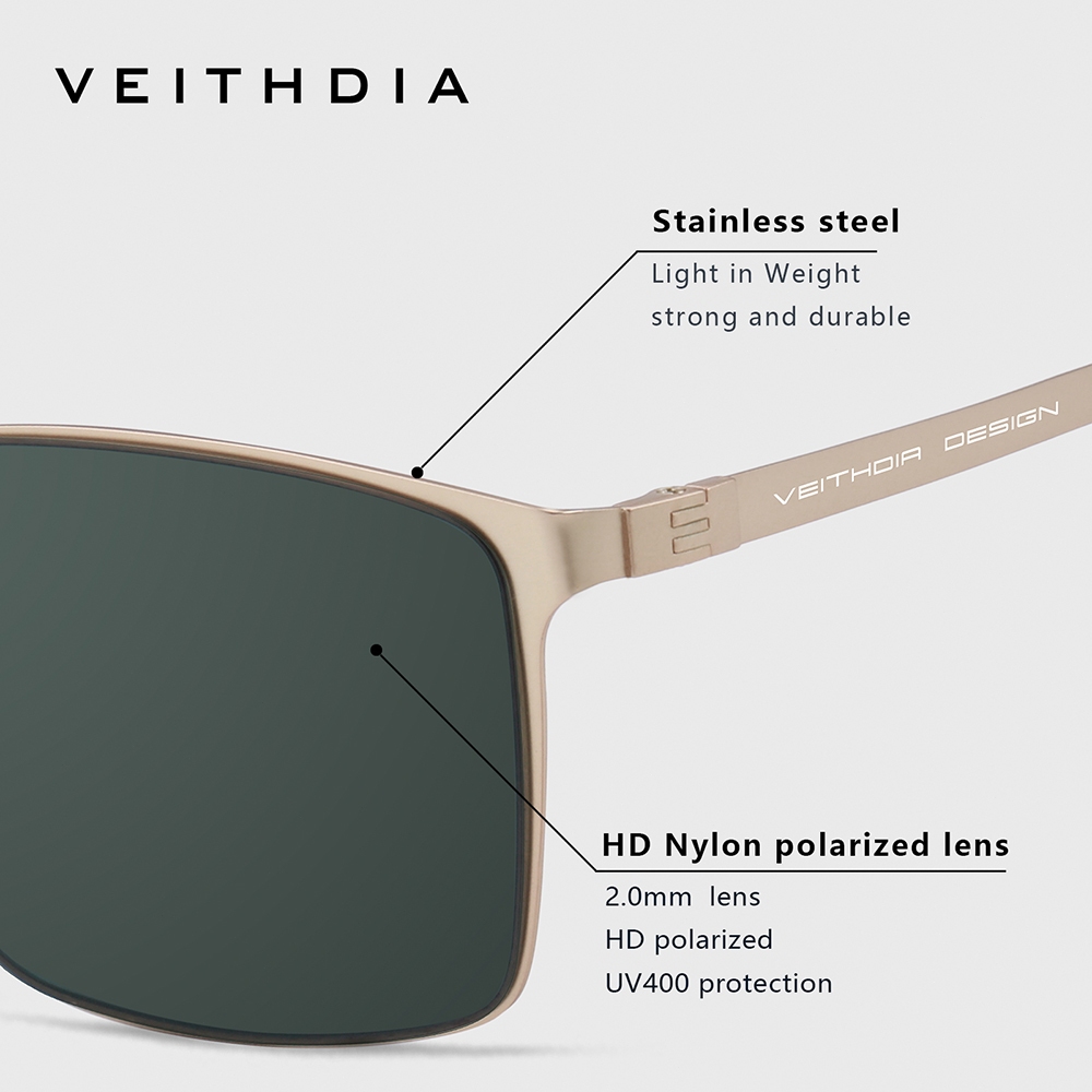 VEITHDIA Kacamata hitam pria polarized anti UV dengan bingkai persegi dari stainless steel dan lensa dari nylon HD model V8212