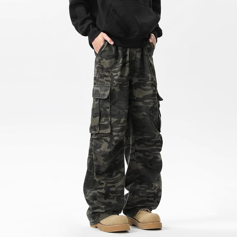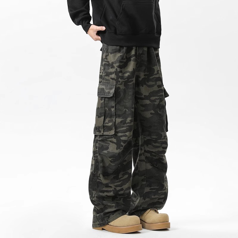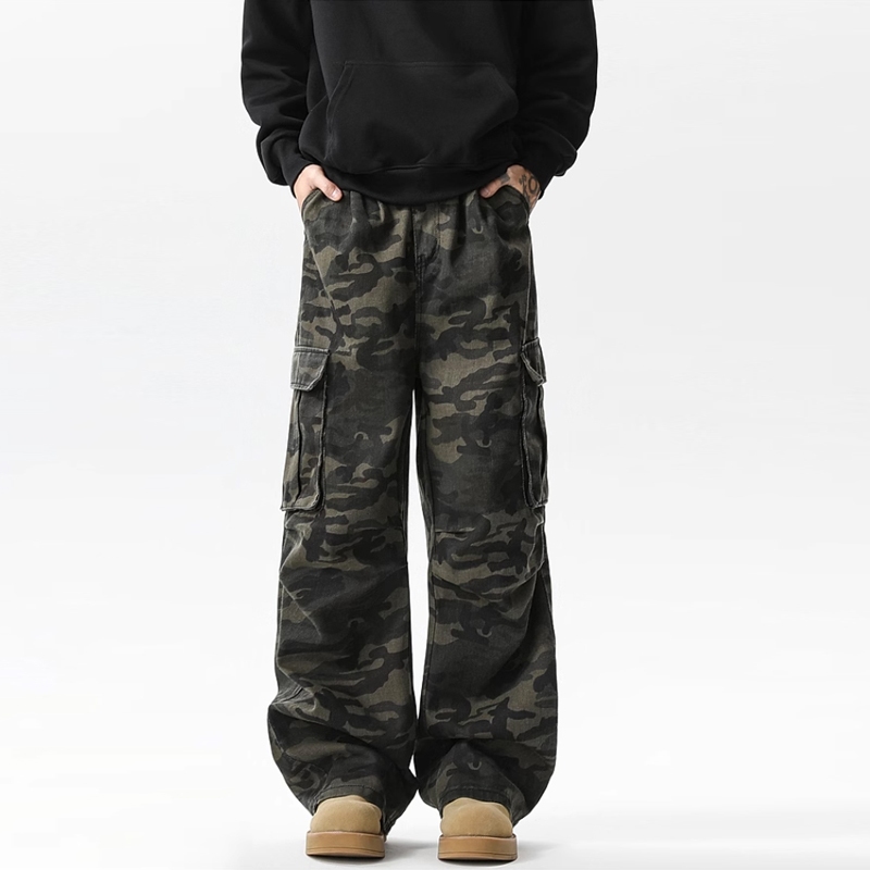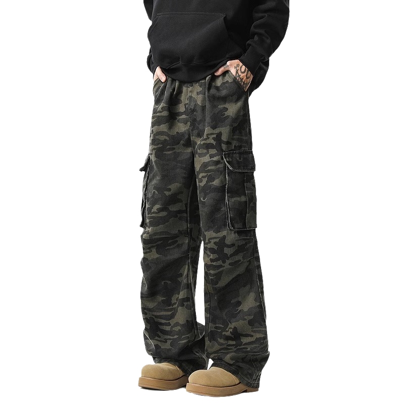 Celana kamuflase multi-saku retro Amerika untuk pria dan wanita, dirancang celana panjang lurus kasual berkaki lebar Mur