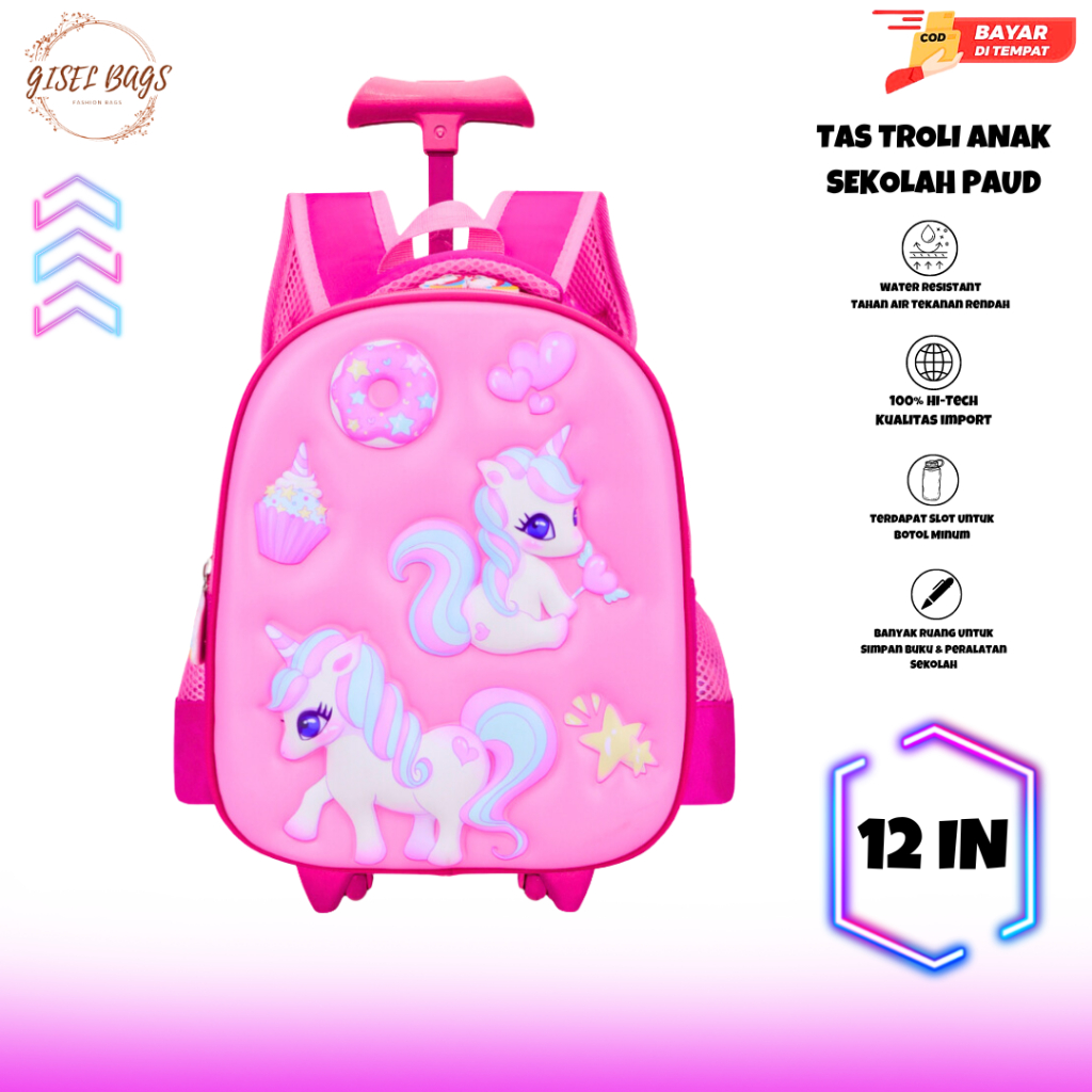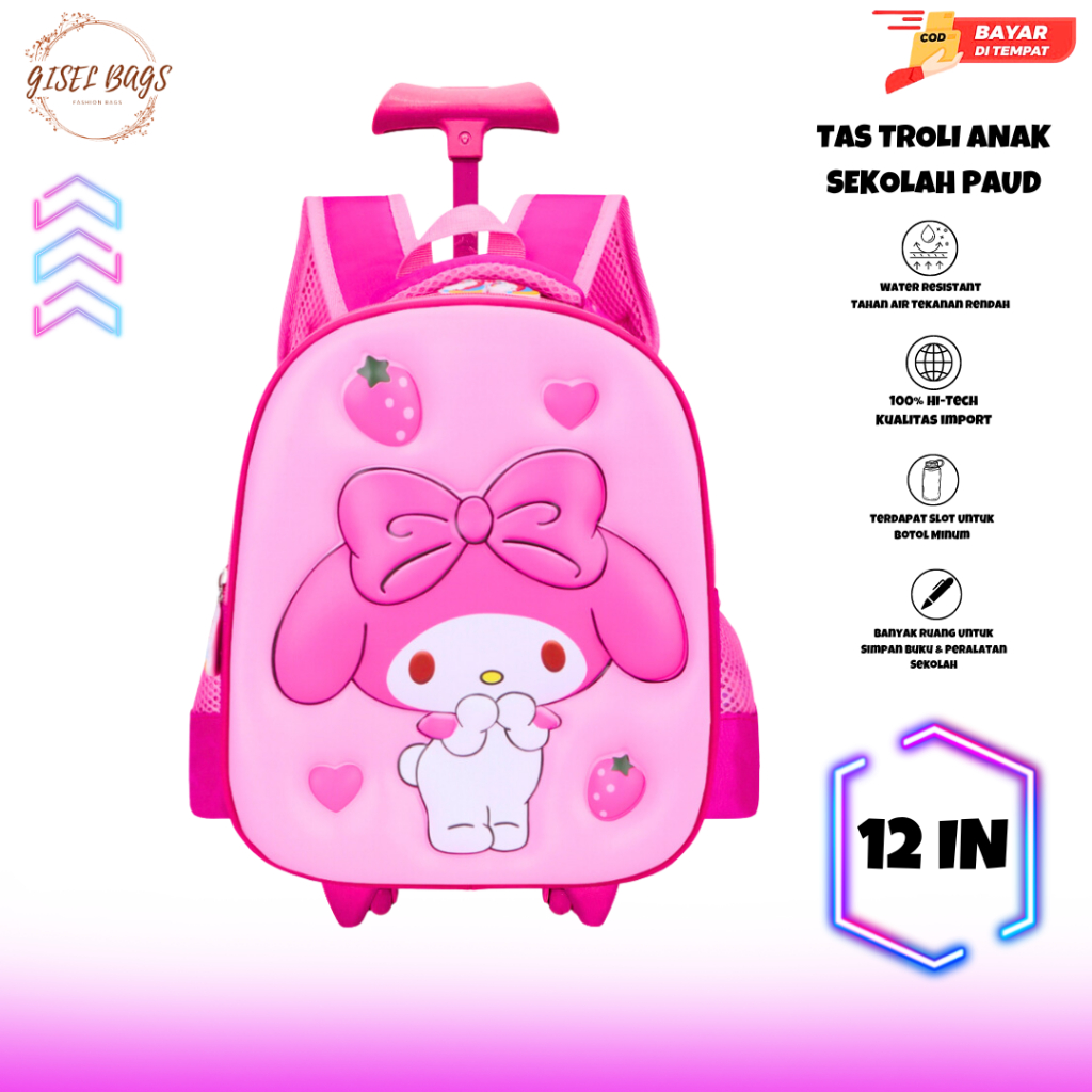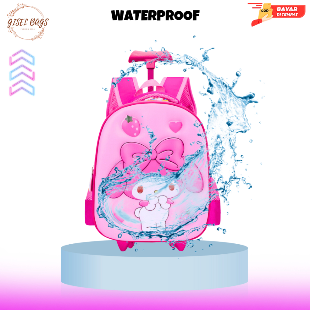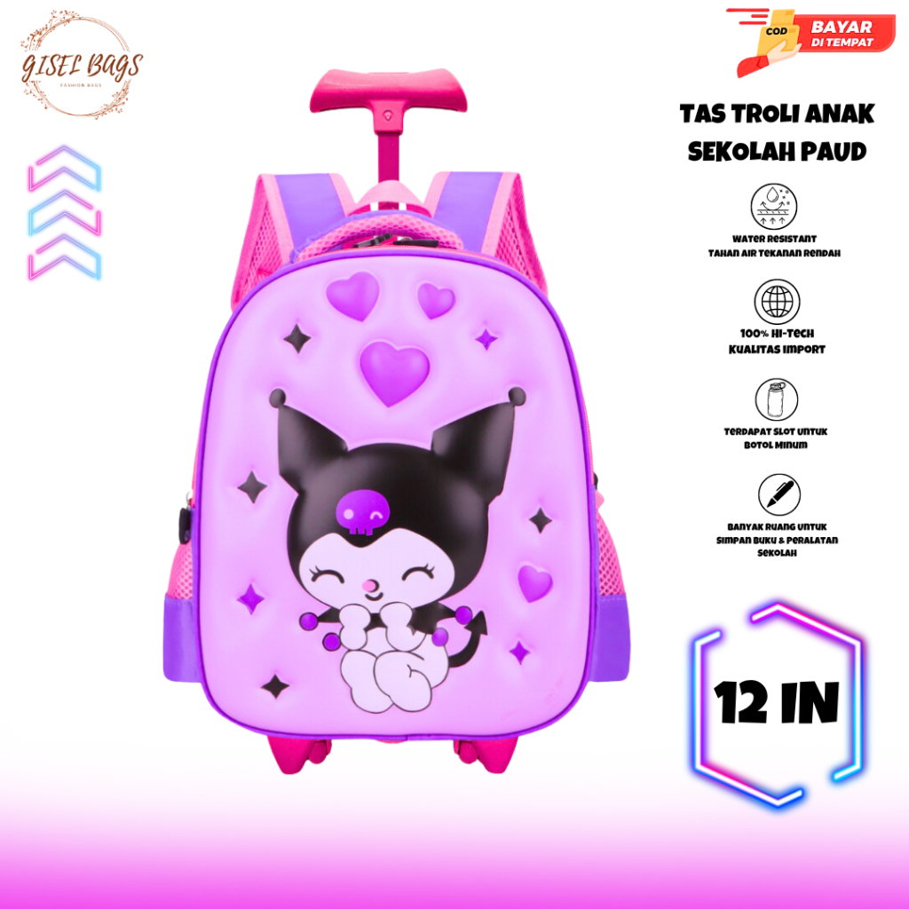 tas koper anak perempuan sekolah tk & paud gambar kuromi timbul 3D ransel troli waterproof