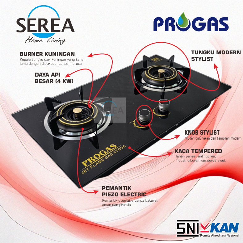 PROGAS Kompor Gas Tanam 2 Tungku PG-569 Kaca Hitam, Bunga Merah SNI Garansi 1 Tahun Api Biru Besar