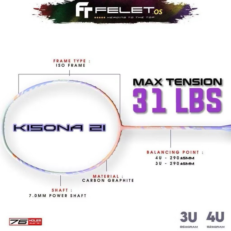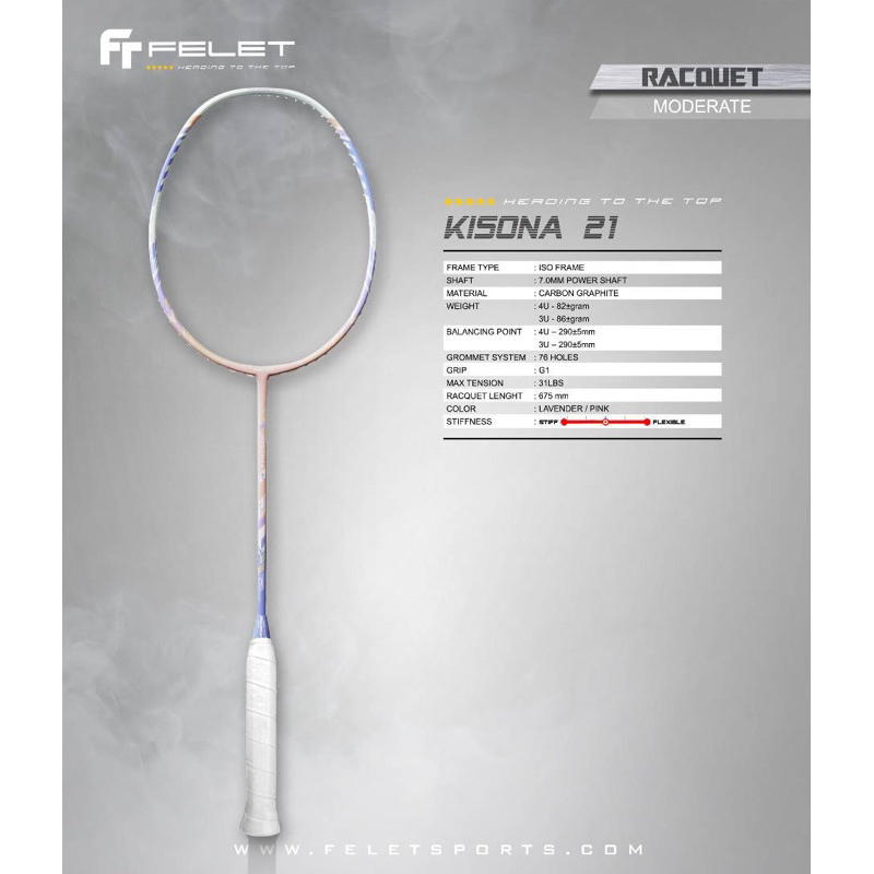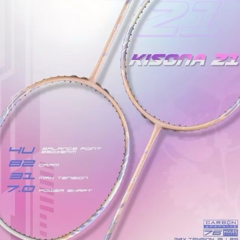 Raket Felet Kisona 21 Lavender Pink Original | Super Ringan | Max Tension 31LBS | Ladies Friendly | Free Senar