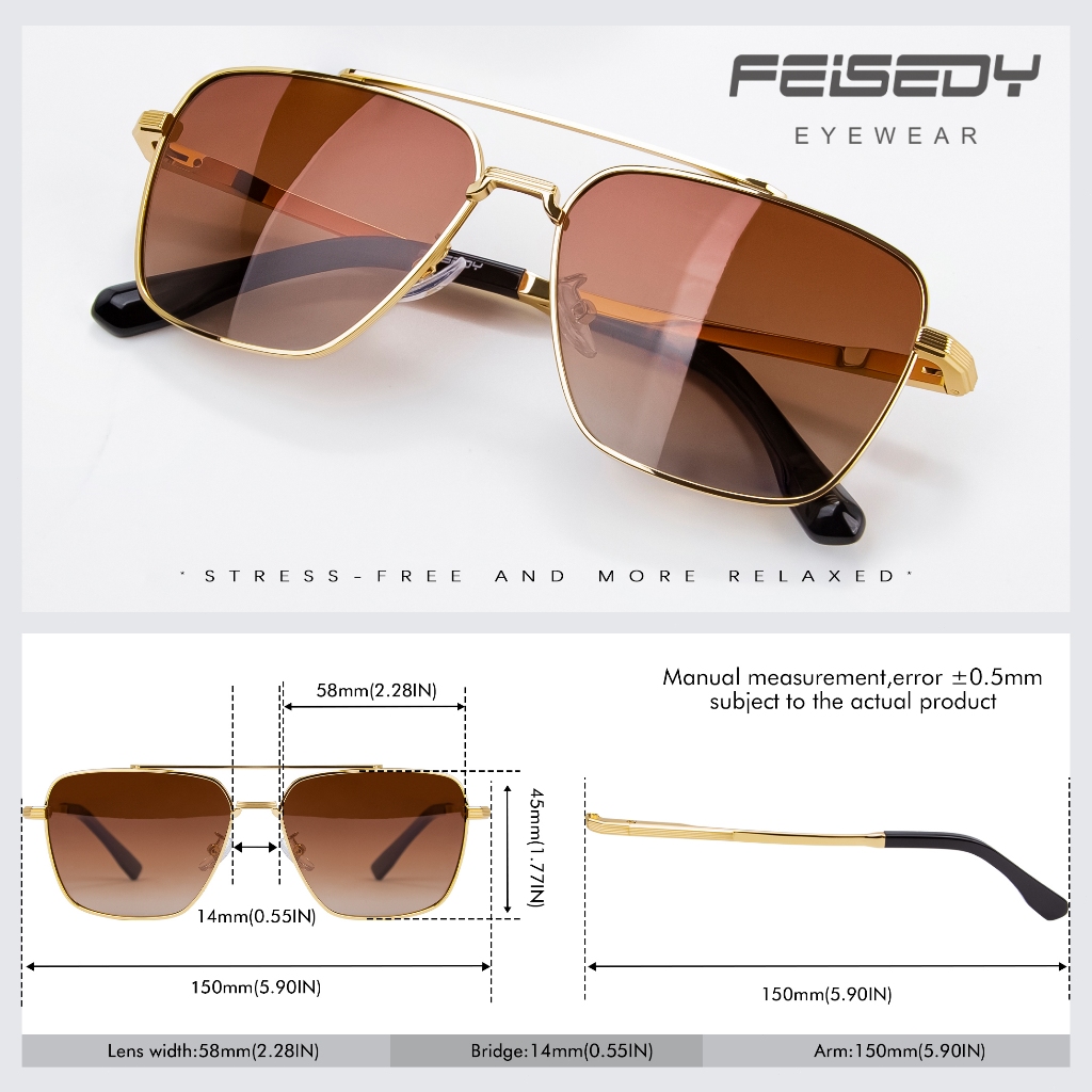 FElSEDY Kacamata Hitam Rectangular Polarized Aviator Sunglasses Pria Retro Pilot Shades Driving UV400 Protection RC2502-2 Gold—Brown