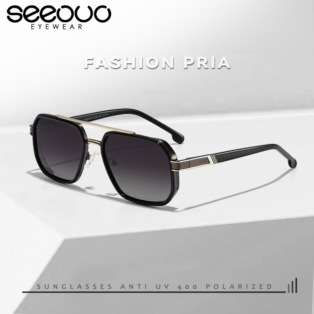 Seeouo Sunglasses Polarized Model Aviator Kotak Fashion Pria Elegan Alloy+TR90 Kokoh Kacamata Hitam Anti UV 400 Anti Silau 2189