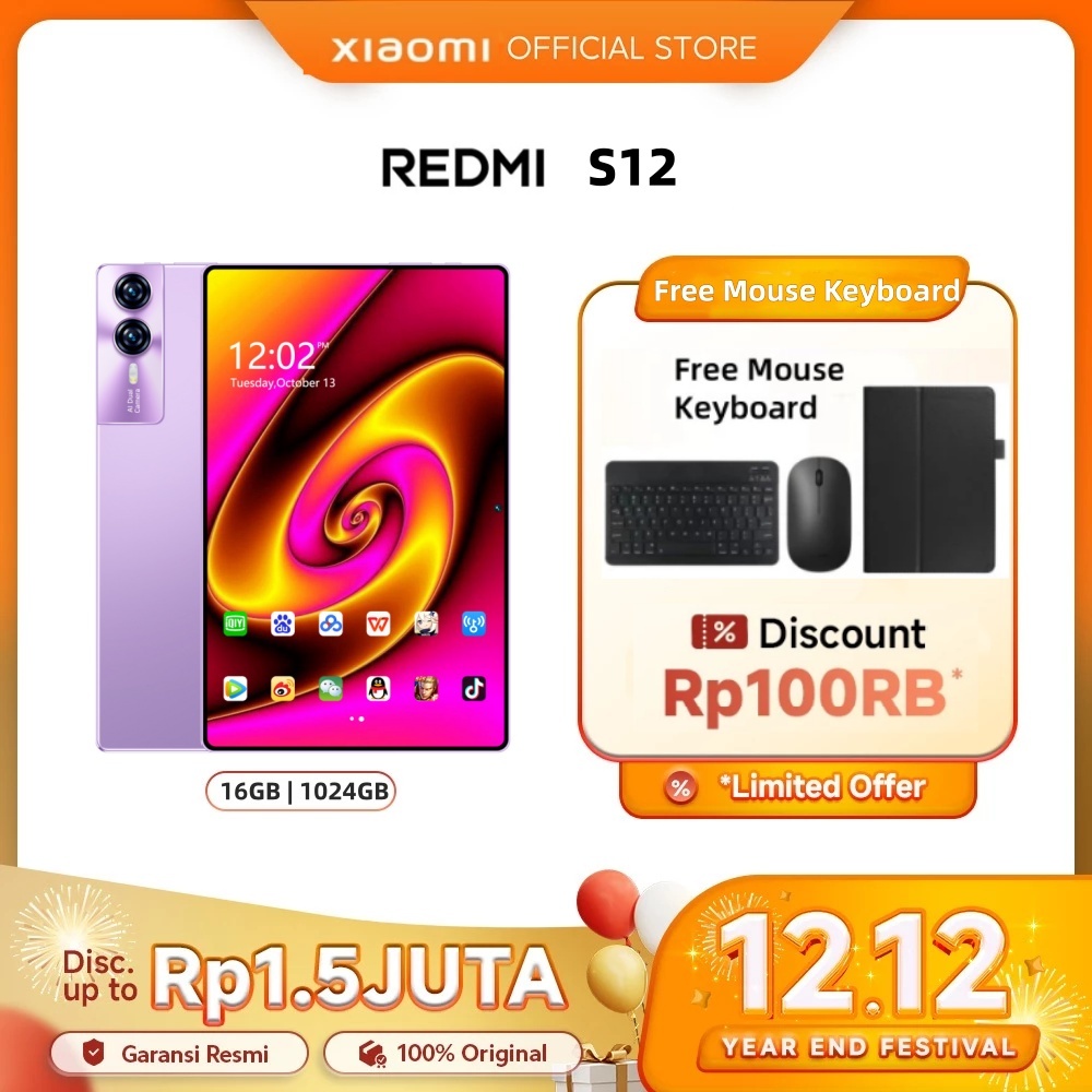 [Free Mouse Keyboard ] Xiaomi Tablet S12 | IPS 11.6" | 16GB+1024GB Murah Tablet Android 5G Tab Dual SIM Wifi Menonton Film dan Belajar Hiburan Kapasitas baterai besar 8800 mAh