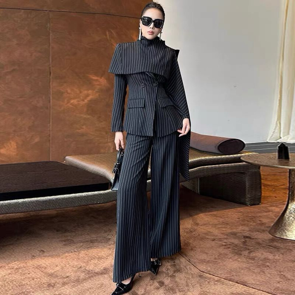 ready stock FADFAD Setelan wanita motif bergaris dengan atasan jubah lengan panjang + celana flare panjang