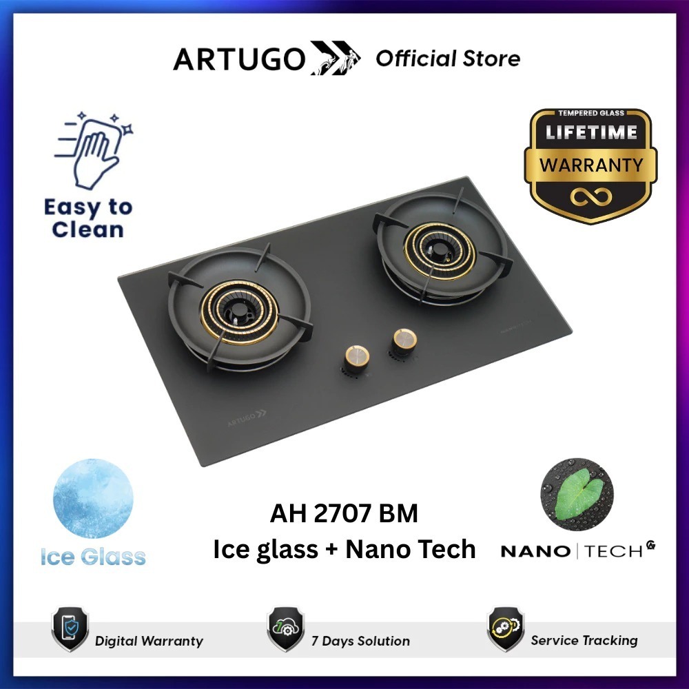 ARTUGO Kompor Tanam Gas 2 Tungku 70 cm AH 2707 BM ( ICE GLASS + Nano Tech )