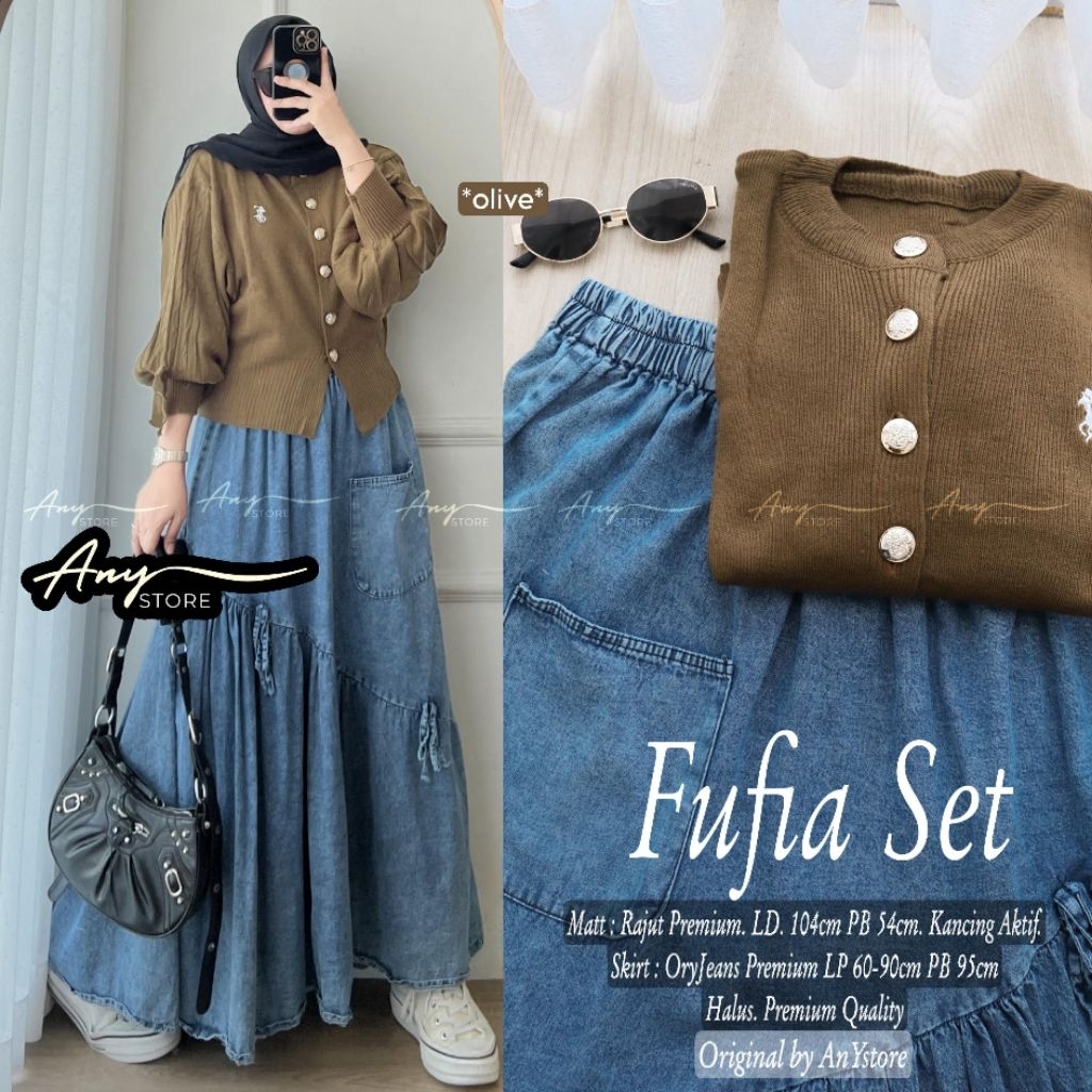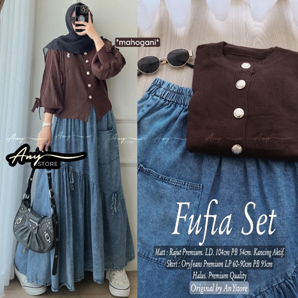fufia one set rok jeans by A.N.Y blouse knit premium rok panjang jeans one set wanita kekinian setelan levis wanita terbaru cardigan knit blouse rajut korean style atasan rajut full kancing