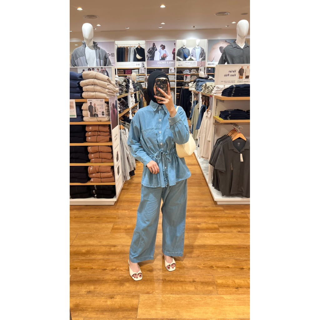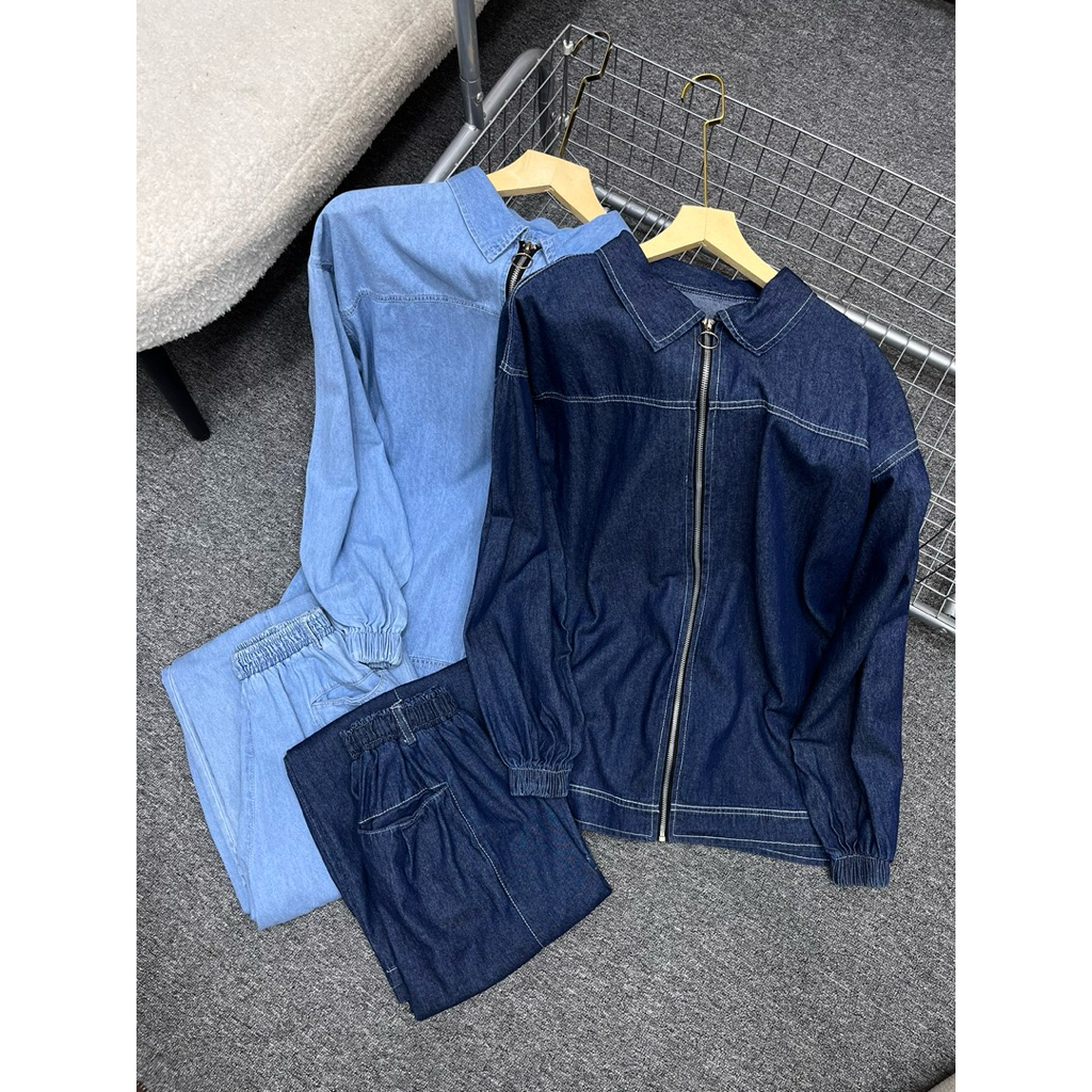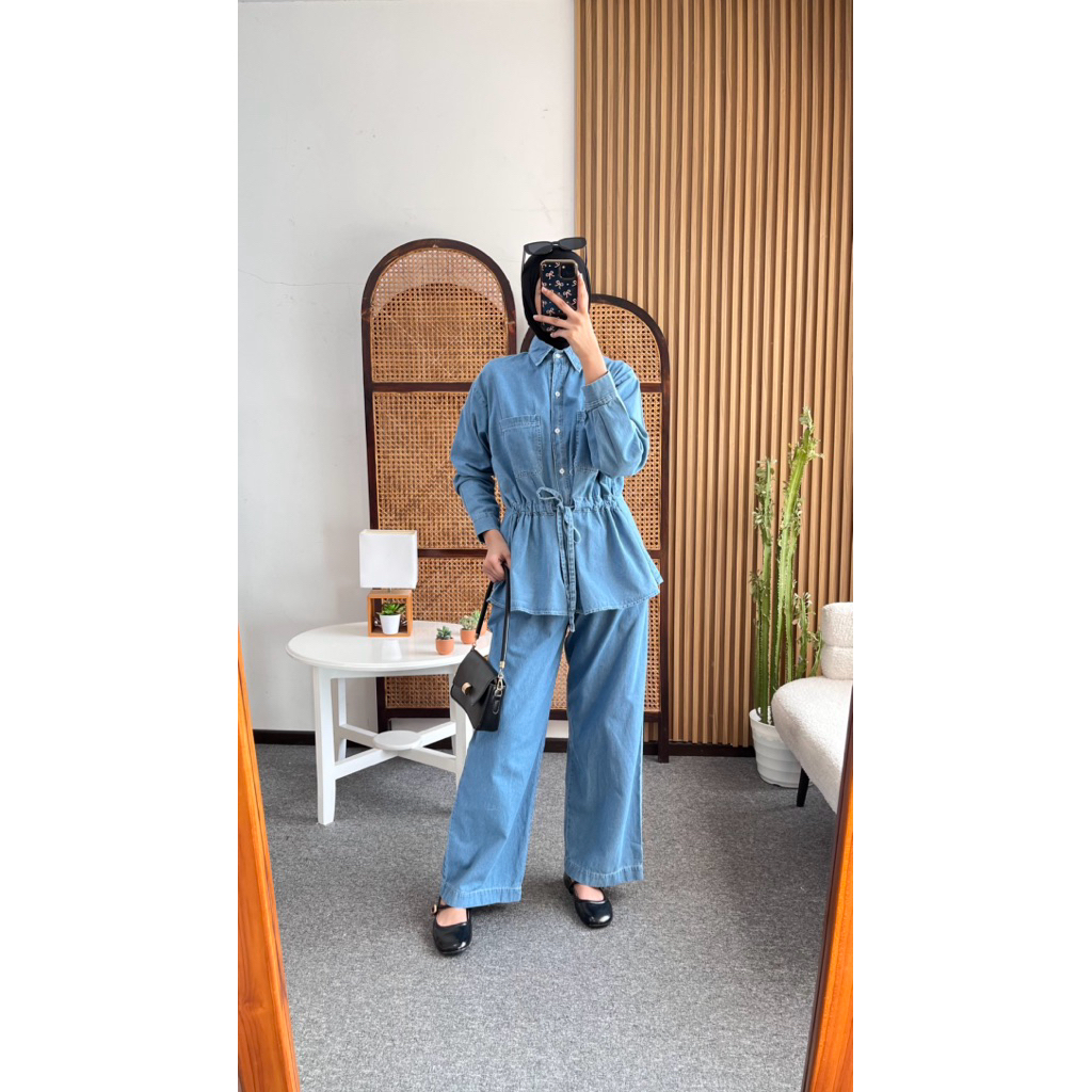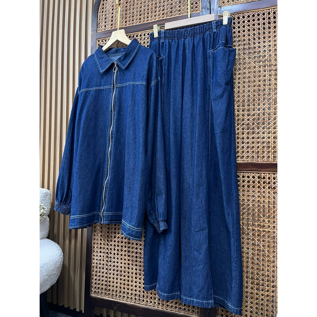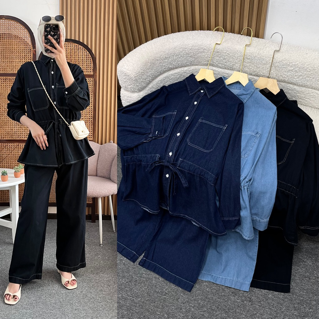 Little butik RIANY JEANS ONE SET | Setelan celana wanita bahan jeans motif salur