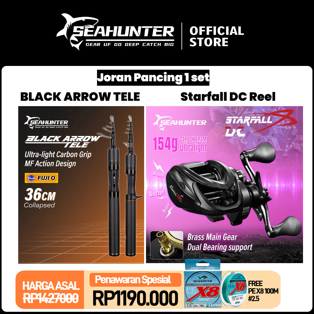SEAHUNTER Starfall DC 1 SET = Starfall DC Baitcasting Reel BC Reel + Black Arrow Tele Casting Joran Pancing + Blue Shark