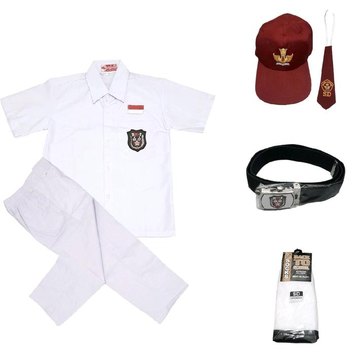 Setelan Seragam Sekolah SD Putih Laki-laki Lengan Pendek Celana Panjang Super Komplit Kelas 1-6 SD