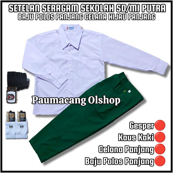 Setelan Seragam Sekolah MI Putih Hijau Anak Putra Baju Putih Polos Lengan Panjang Celana Hijau