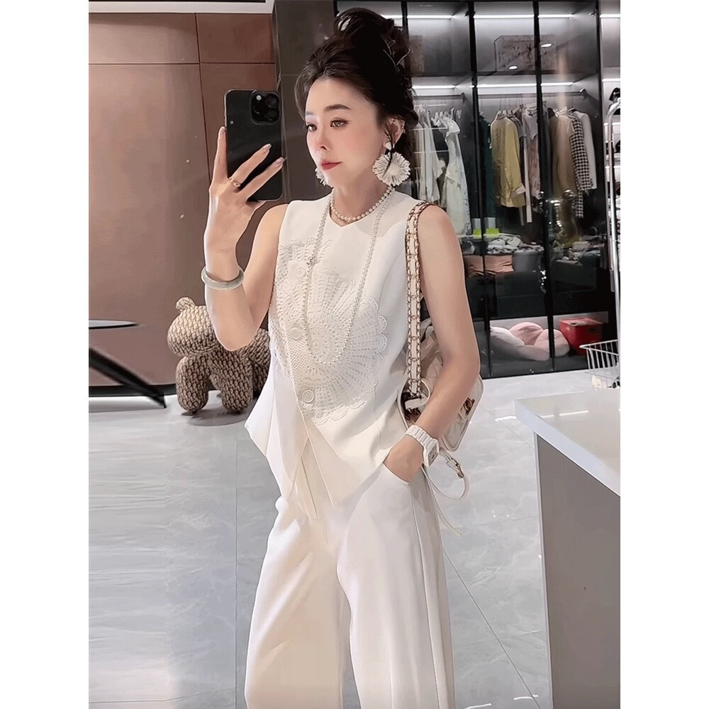 Setelan dua potong modis atasan tanpa lengan dan celana pinggang tinggi untuk wanita