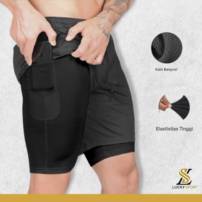 Celana Pendek Olahraga 2 in 1 Pria Wanita Running Sport Joging Gym Lari Fitnes Sporty Kompresi Shorts Murah Gratis Ongki