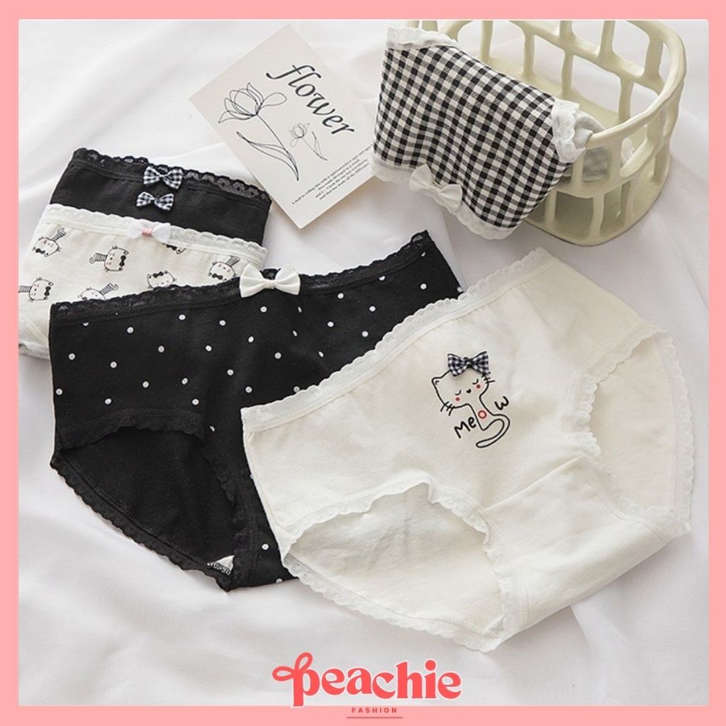 PEACHIE CD1588 Celana Dalam Sutra Briefs Elastis Mid Waist Pakaian Dalam Motif Cat Hitam Putih Murah Gratis Ongkir