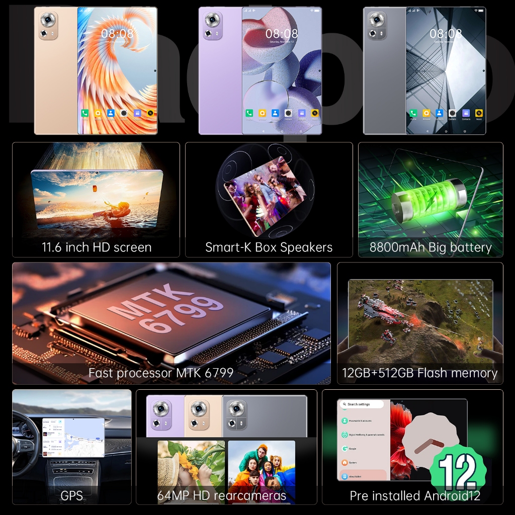 [FREE SPEAKER + PEN] Tab PadPro| Dual Sim Card 4G LTE | Layar 11.6” HD IPS | 512GB+RAM 12GB | MTK6799 | Android 13 | Garansi Resmi 1 Tahun