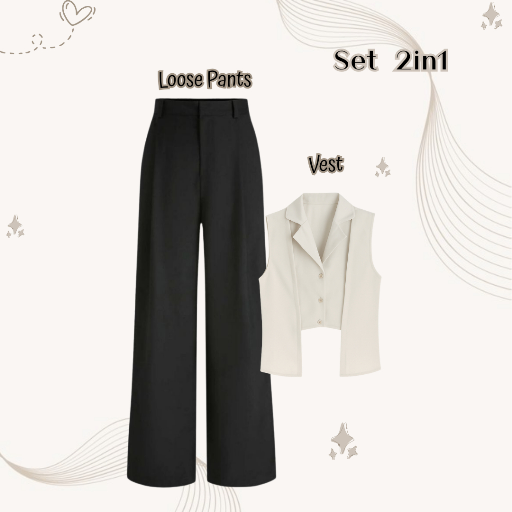 Outfit Mecca 4in1 ( Hijab + Inner + Cest + Loose Pants ) Oneset Cantik Simpel Elegan OOTD Wanita Karir Modis dan Aesthetic - BE218