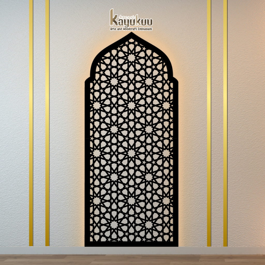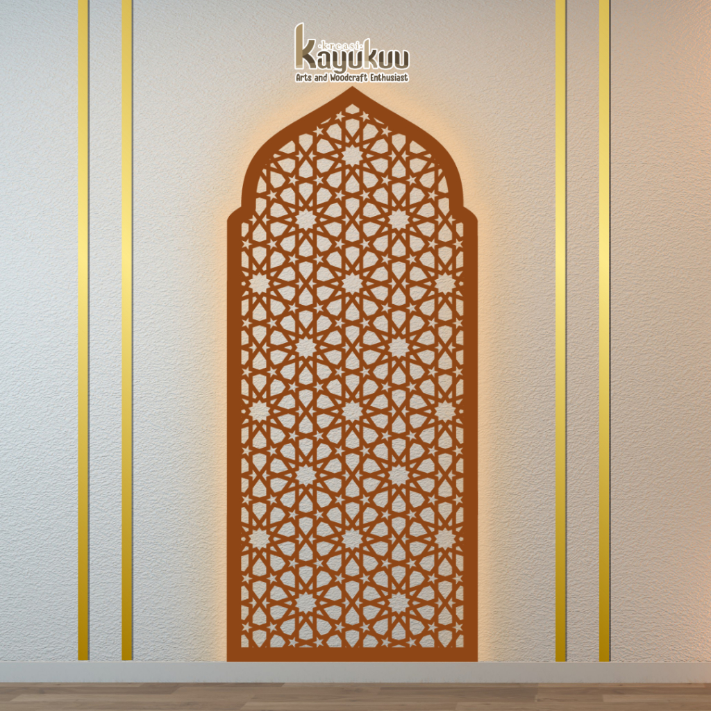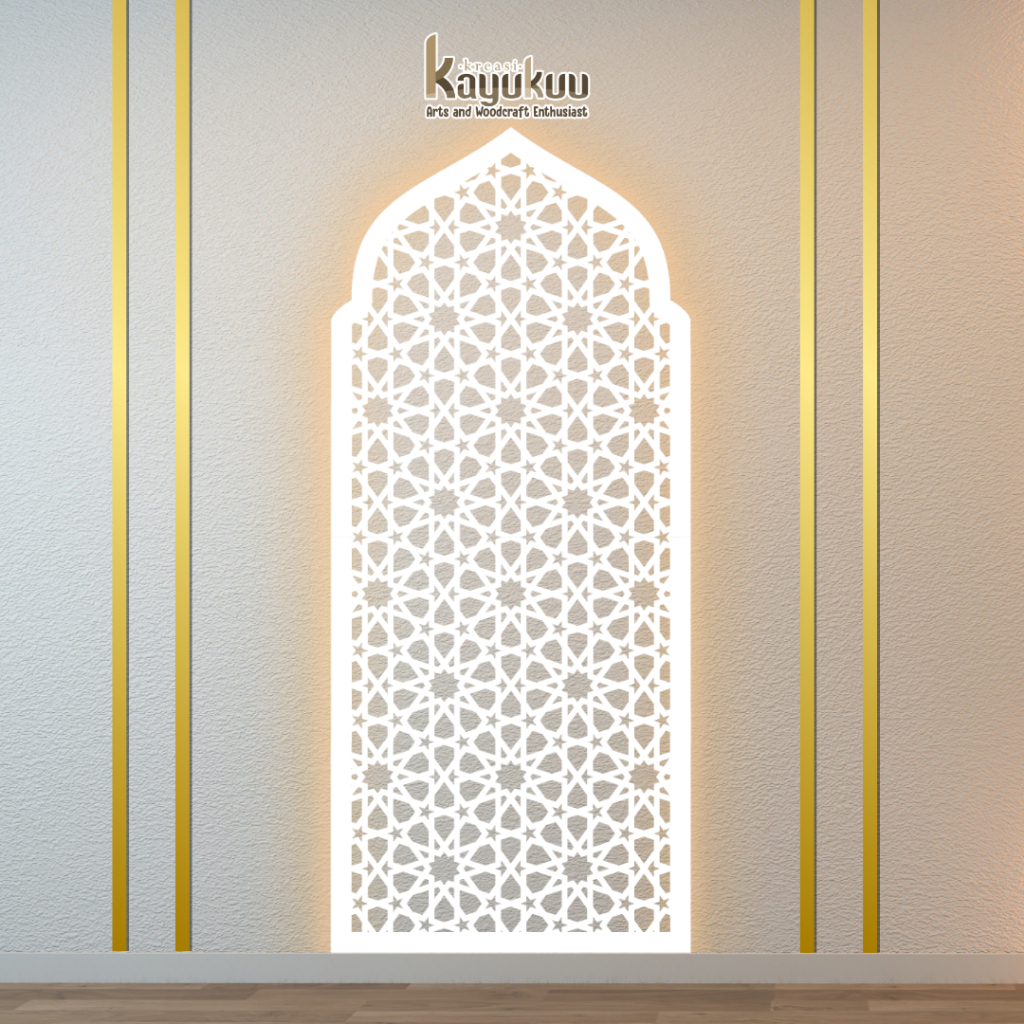 Kreasikayukuu Mihrab Mushola Kubah + LED Hiasan Dinding Mushola Mimbar Masjid Bahan Kayu Plywood 3mm
