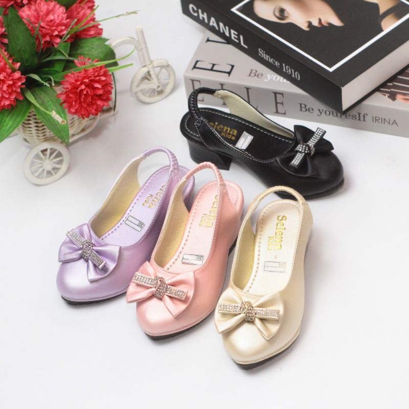 Sepatu Sandal Pesta Anak Perempuan Hak Tahu Pita Permata Karet Kagura KP13