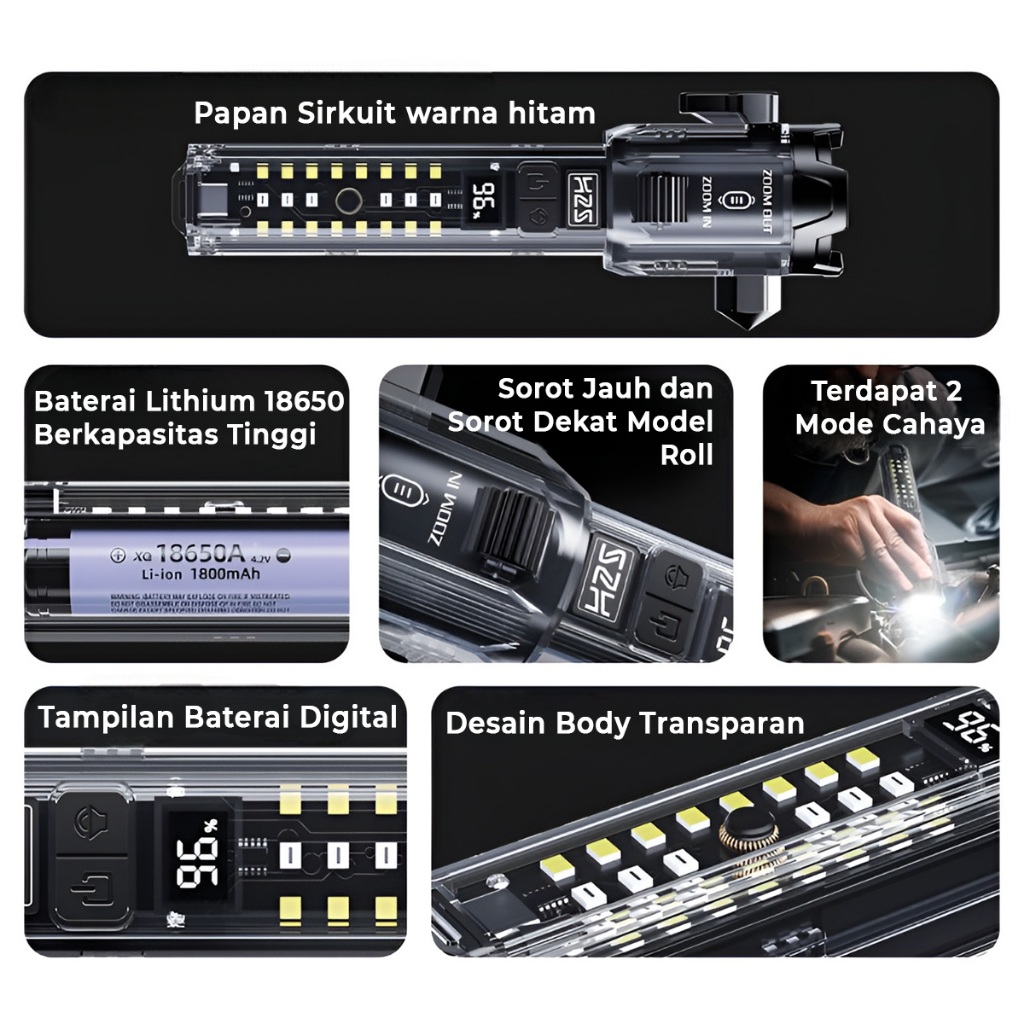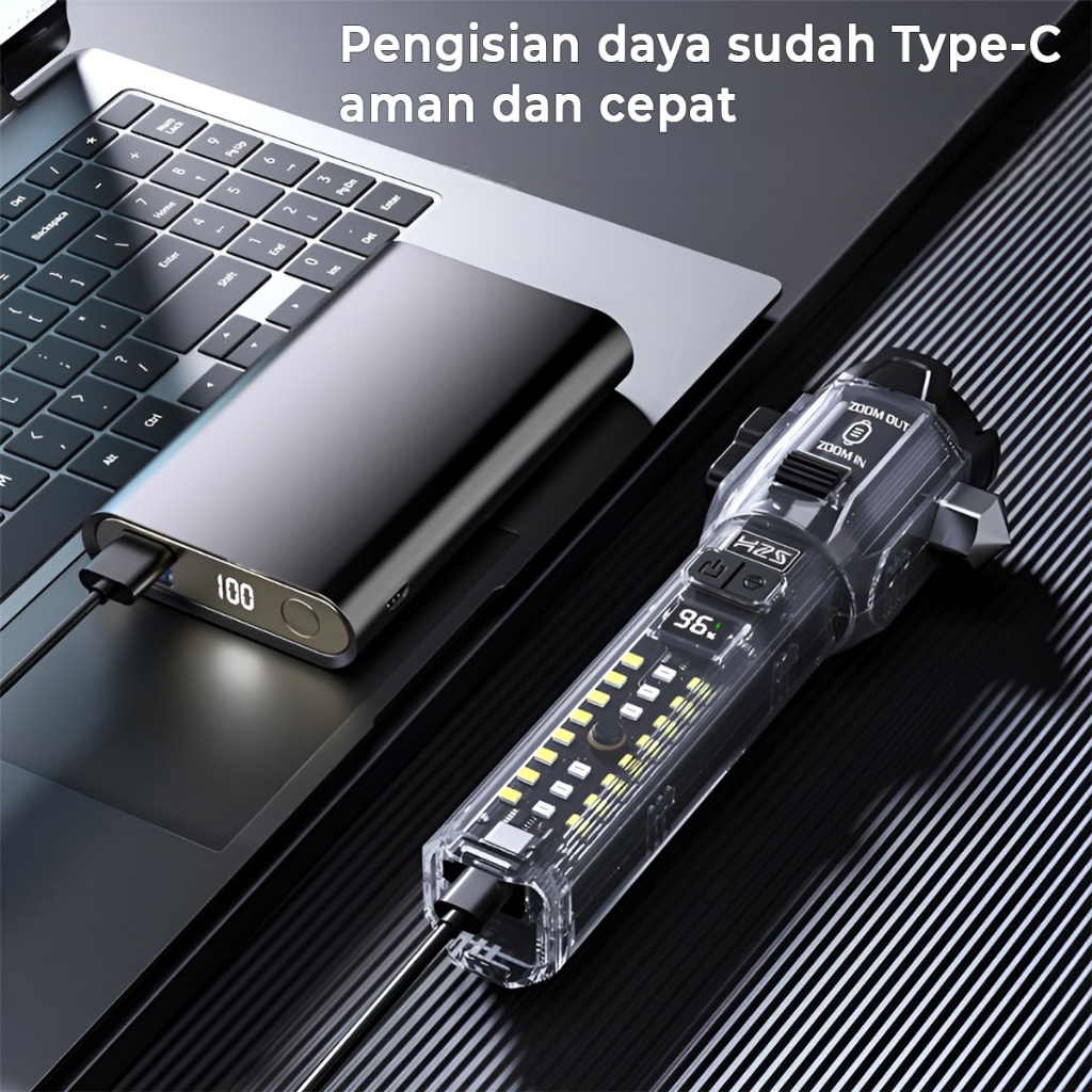 H2S Senter Safety 10 IN 1 LED Laser 30w Cas Roll Zoom In Out Hammer Emergency Alarm HS-L7F