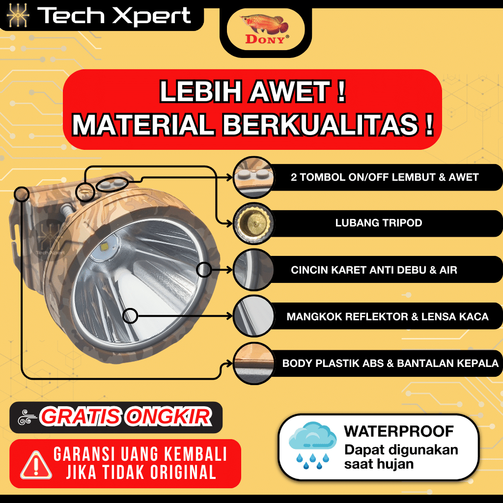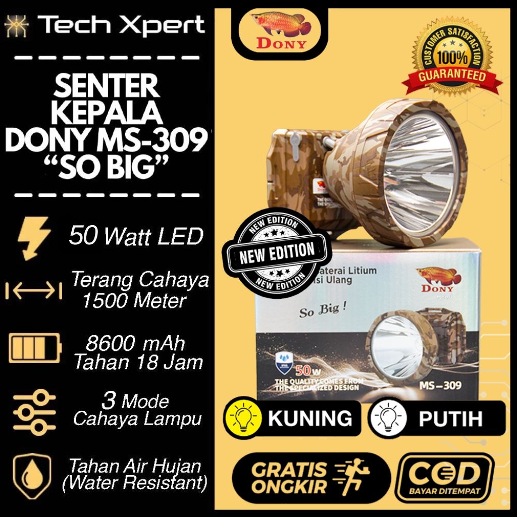 SENTER KEPALA LED DONY 50 WATT MS-309 "SO BIG" ORI SUPER TERANG ANTI AIR FREE TRIPOD OUTDOOR