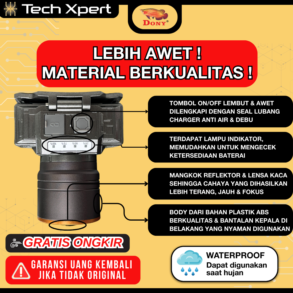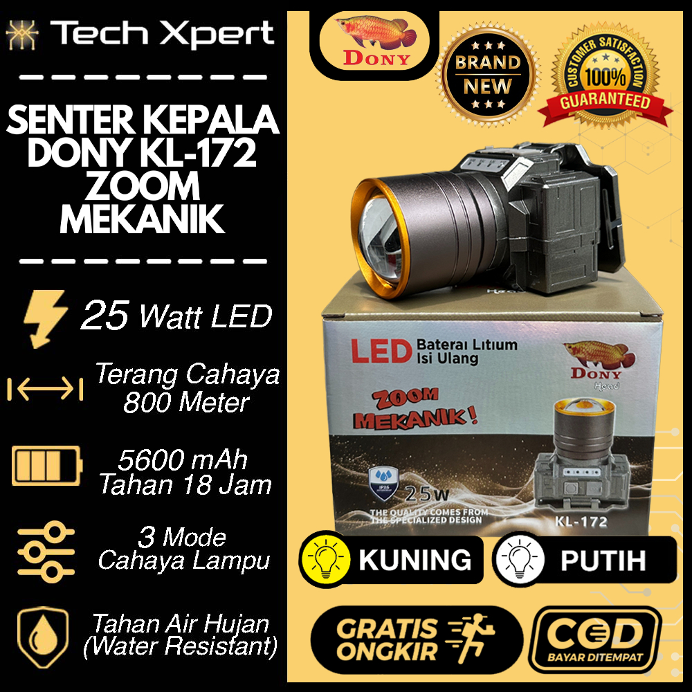 SENTER KEPALA LED DONY 25 WATT KL-172 "ZOOM MEKANIK" ORI ANTI AIR TAHAN LAMA OUTDOOR UKURAN SEDANG