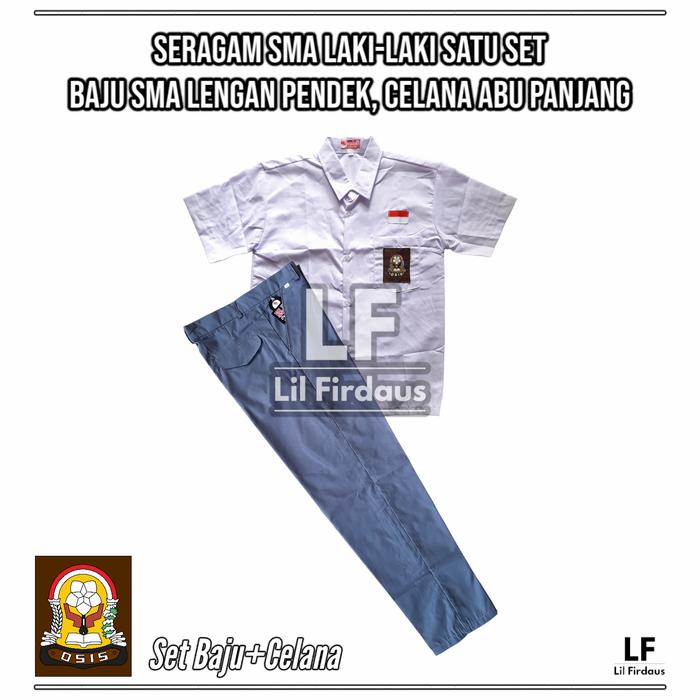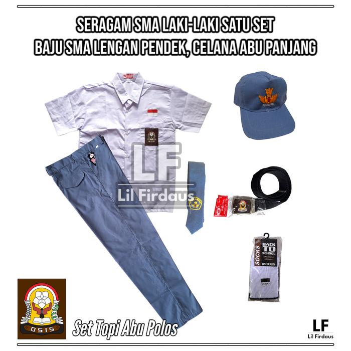 SETELAN SERAGAM SMA LAKI BAJU SMA LENGAN PENDEK CELANA ABU PANJANG - TOPI ABU PUTIH, S