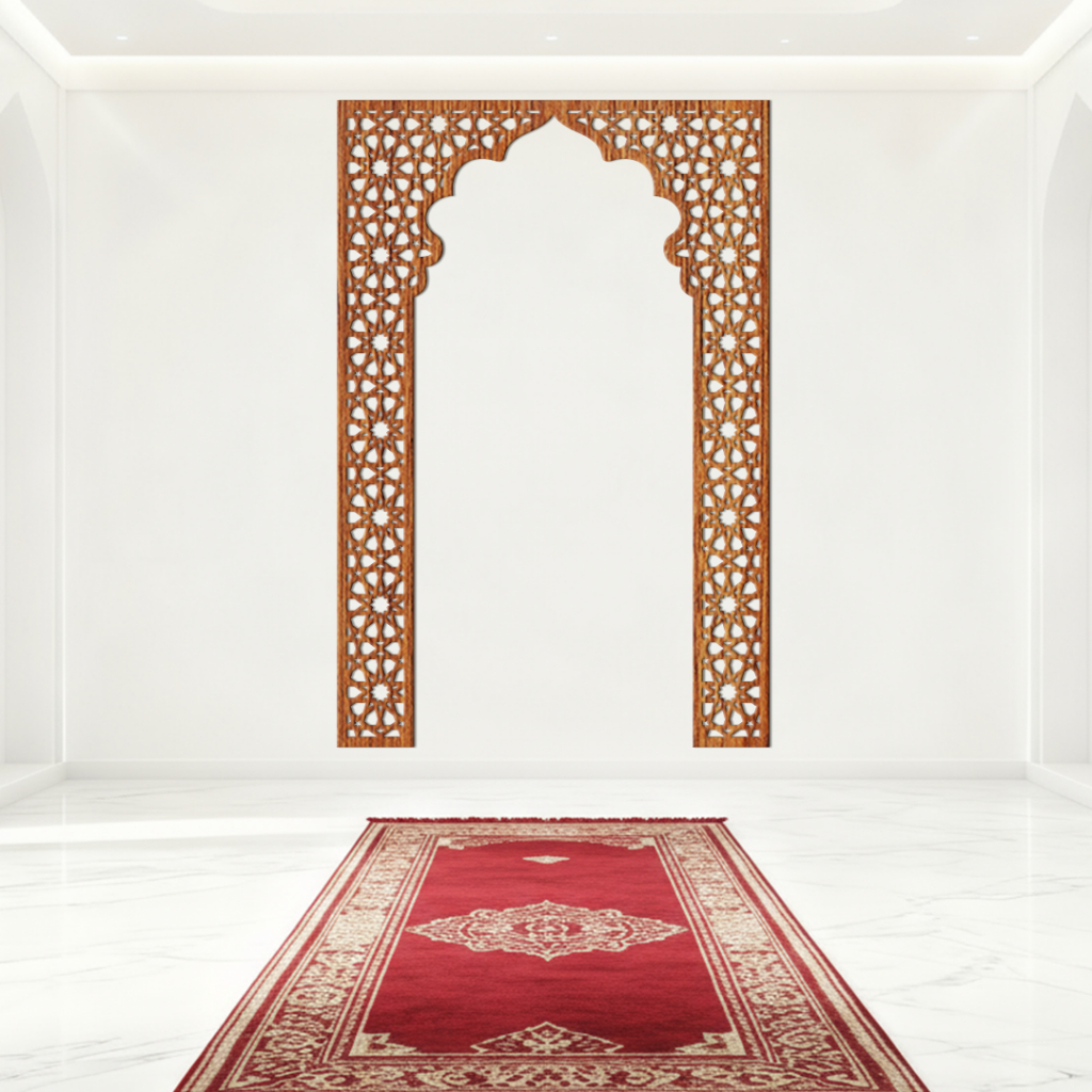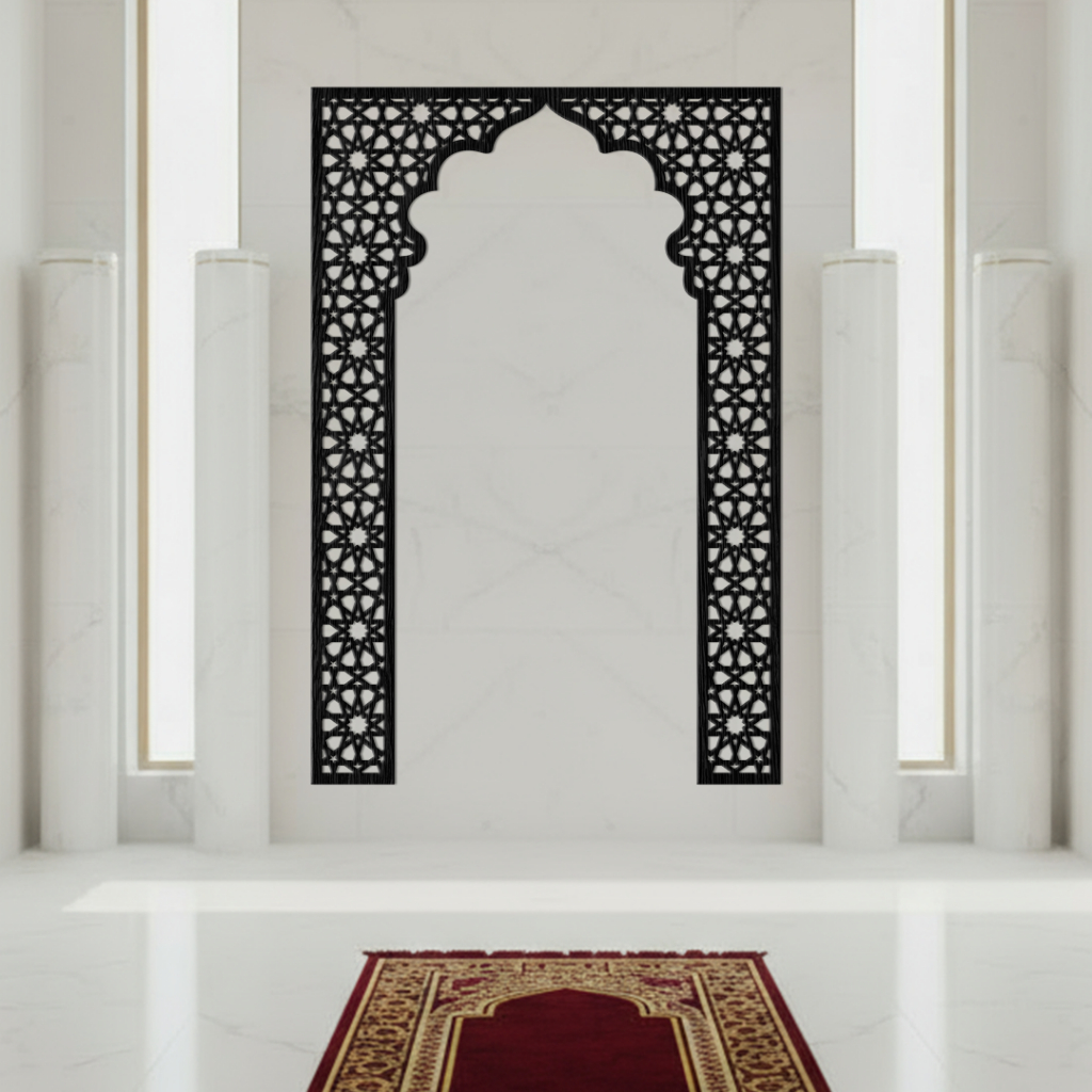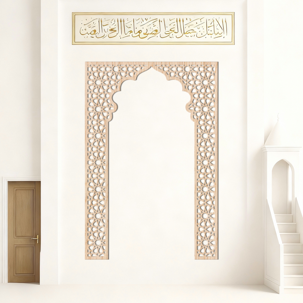 Dekorasi dinding Kaligrafi Mihrab Musholla Kubah Bahan Kayu Plywood Laser Cutting