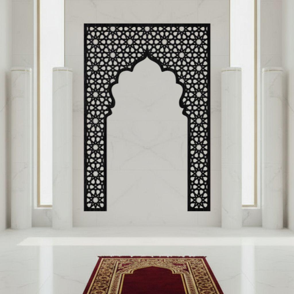 Dekorasi dinding Kaligrafi Mihrab Musholla Kubah Bahan Kayu Plywood Laser Cutting