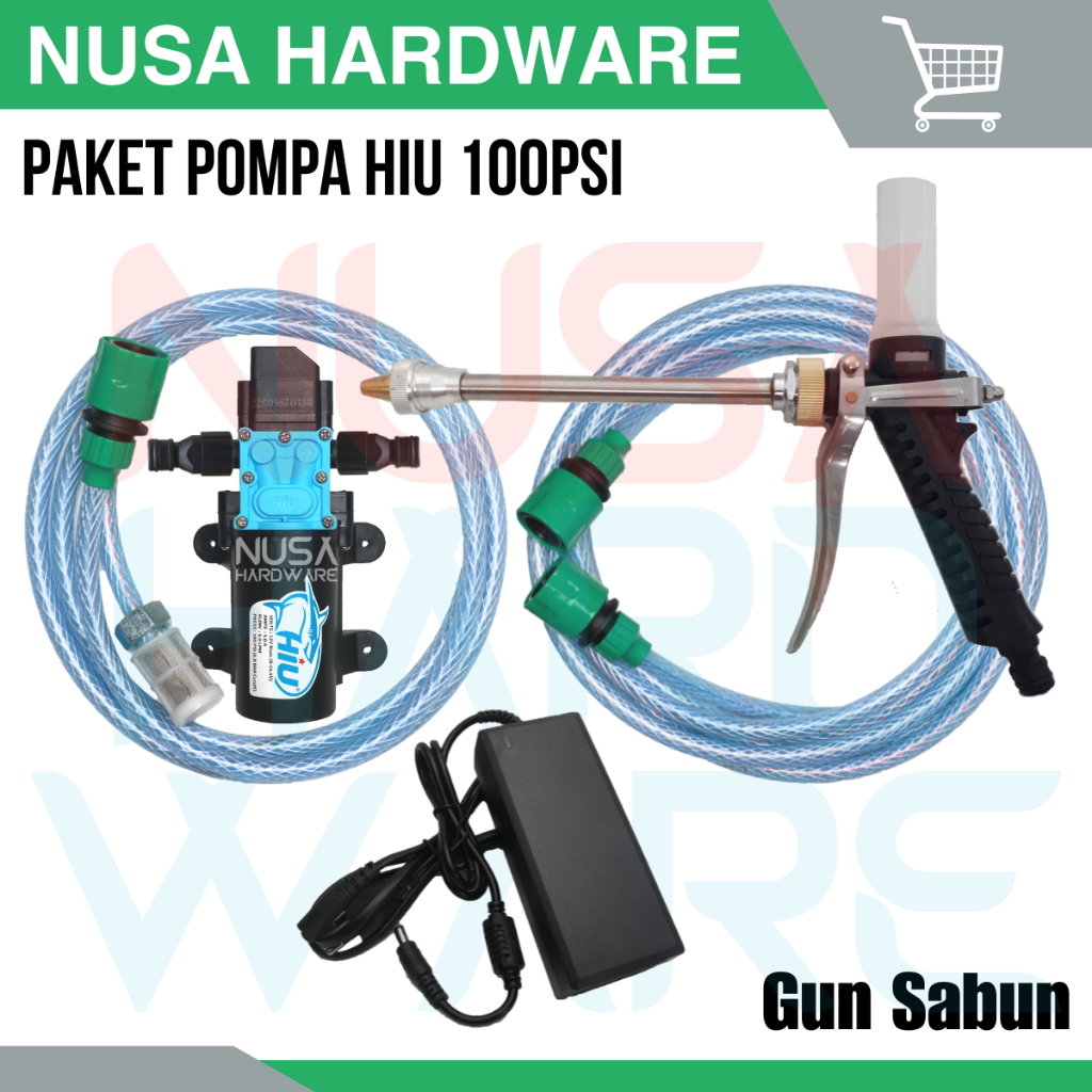 Paket Lengkap HIU 100 Psi Original Mesin Cuci Motor Alat Steam Sprayer Portable Pompa Air 12V + Gun Model Sabun + Adapto