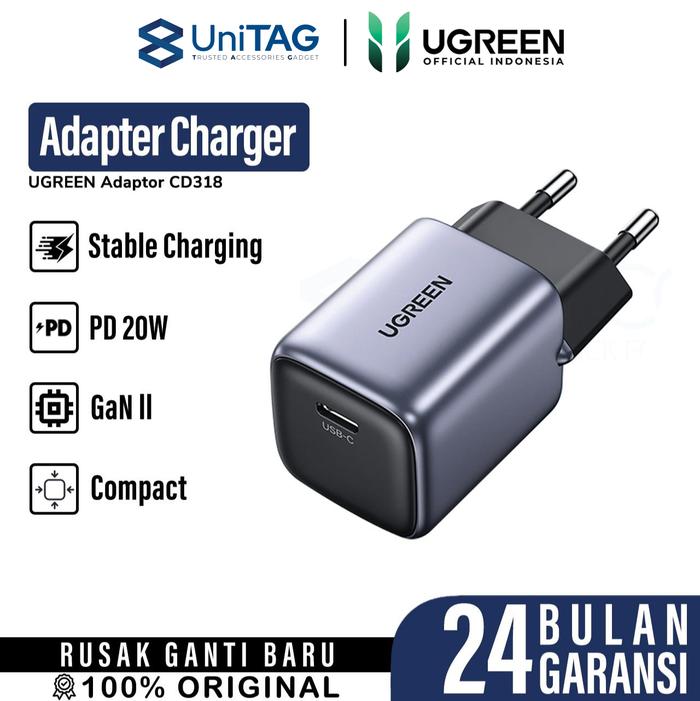 Wall Charger Adaptor UGREEN 20W USB Type C PD QC 3.0 GaN Fast Charging Adapter Kabel Cable - 20W CD318