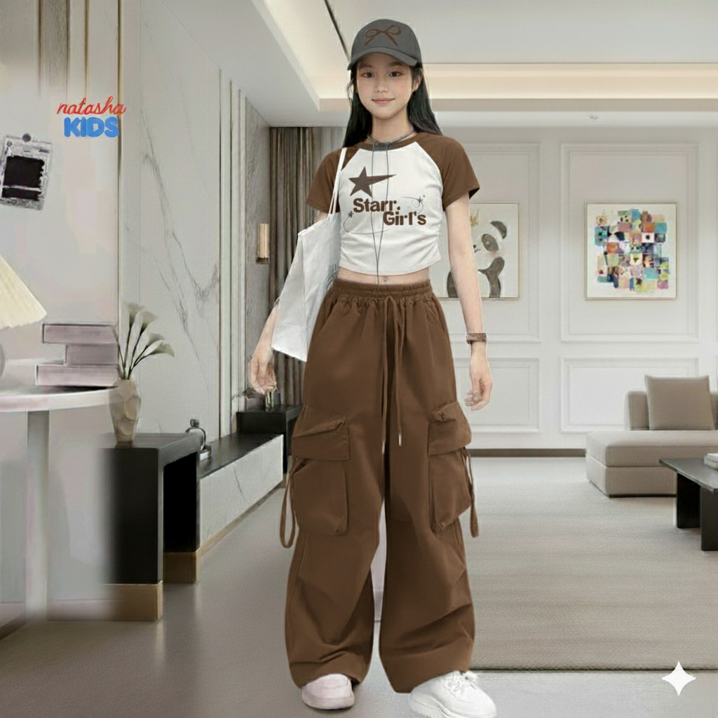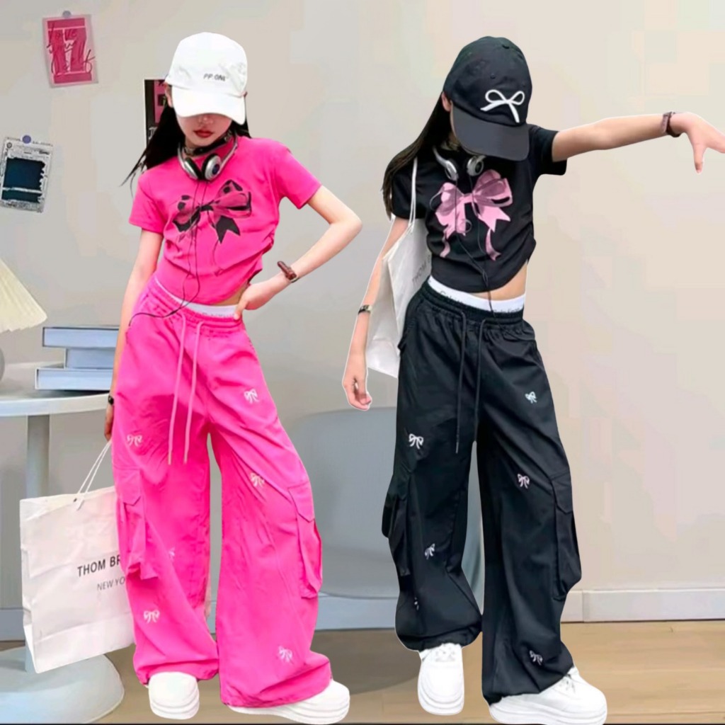 Setelan Anak Perempuan Streetwear Bow Series – Cargo Pants & Kaos Crop usia 1-12 tahun