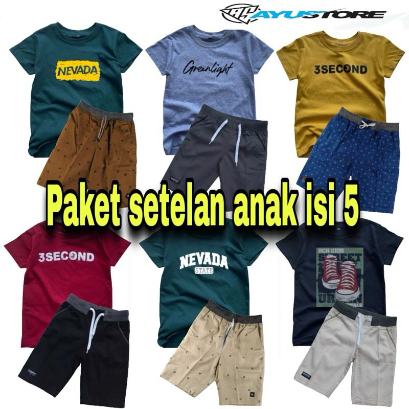 Setelan Anak Cowok Isi 5 Baju Stel Celana Motif Polos unisex kaos anak laki perempuan