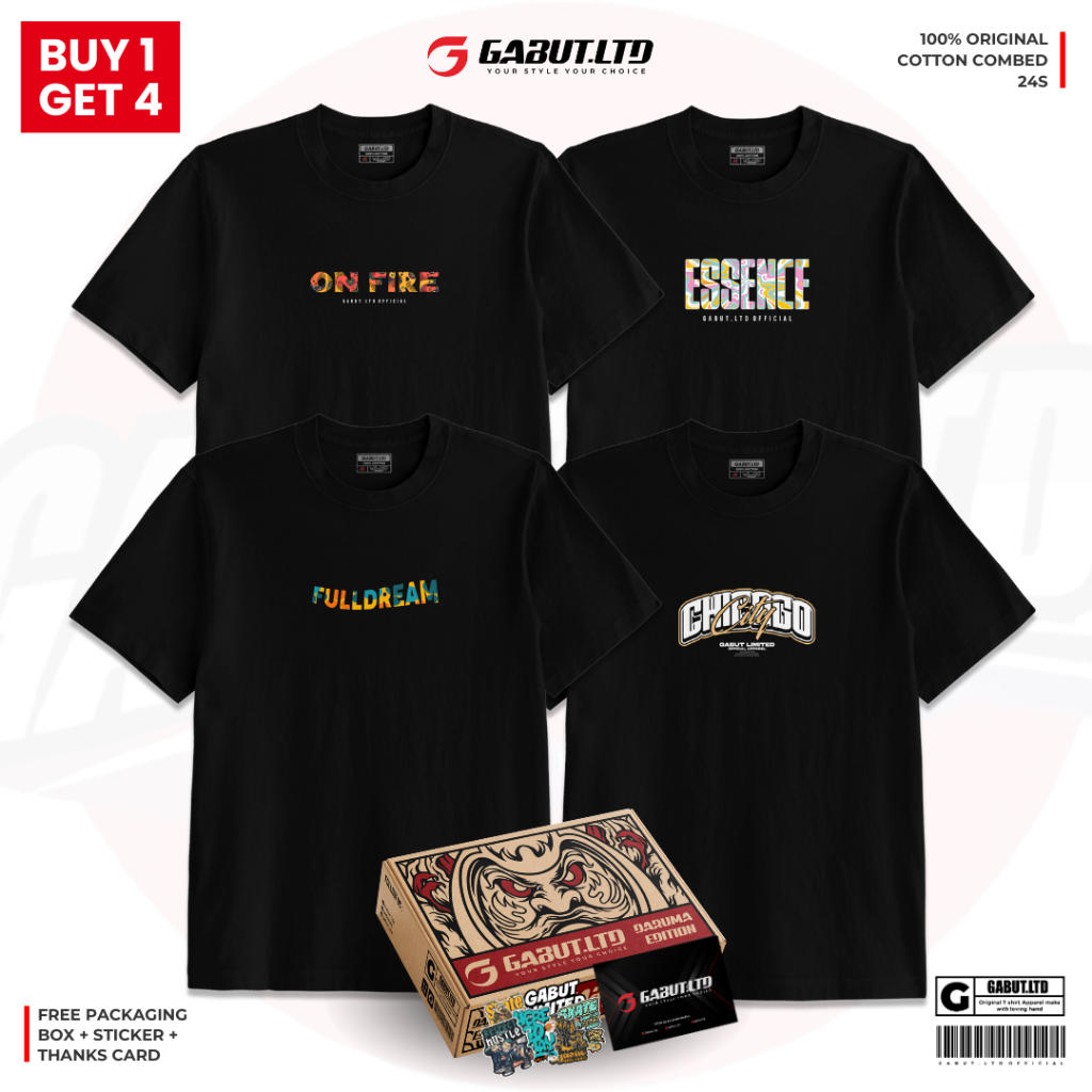 [GABUT] - Paket Bundling 4pcs Kaos Distro Unisex BDGBT4-007 On Fire , Essence, Fulldream , Chicago City Bahan Cotton Combed 24s Baju Kaos Oblong Pria Wanita 100 persen Produk Original