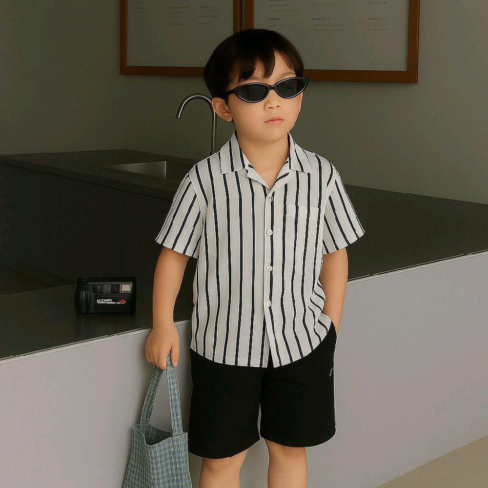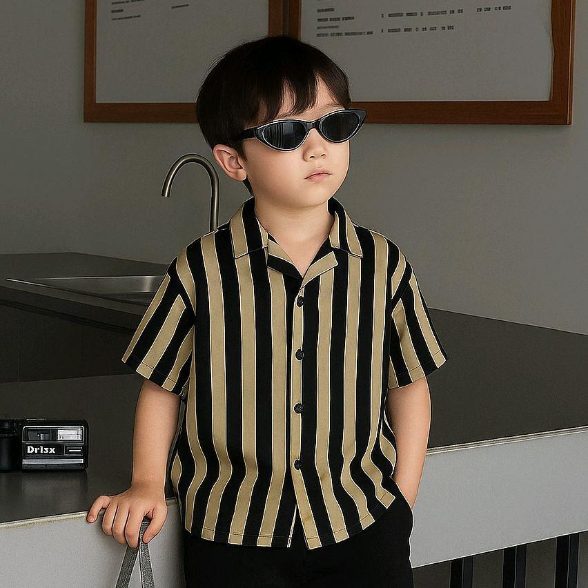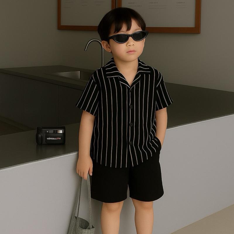 Setelan Anak Laki -Laki Usia 3-8Tahun Kemeja Anak Lengan Pendek Wollfis Garis-Garis & Celana Pen