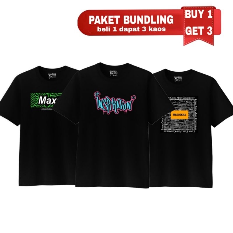 Maxskill PAKET BUNDLING [ BELI 1 DAPAT 3 ] INSPIRATION+GREEN IMAGE DESIGN+LOOK COOL AND CONFIDENT T-shirt Hitam Kaos Distro Cotton Combad 24s