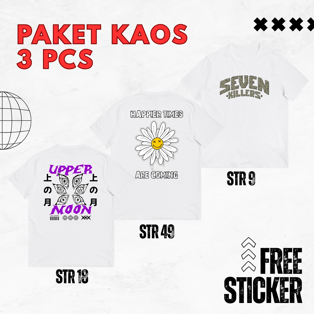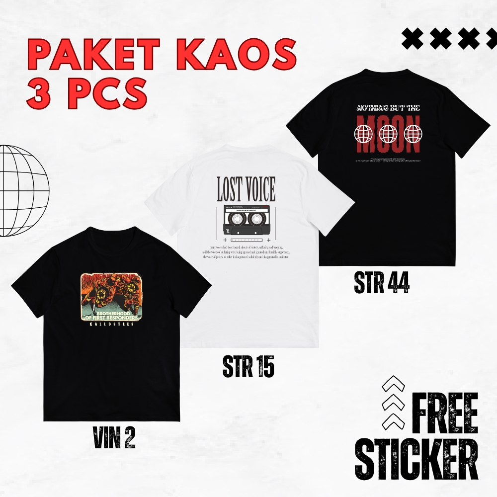 PAKET HEMAT 3 Kaos Distro Pria Unisex | 100 persen Cotton Combed 24s Hitam Putih | GRATIS STICKER – KALLOSTEES