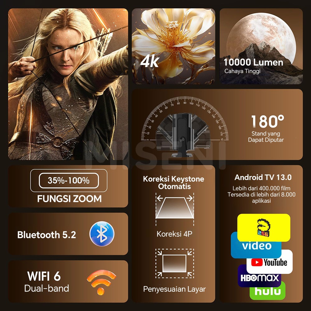 MISENI HY320 Mini Smart Proyektor Android 13.0 4k full hd 2G RAM+16G ROM Dual Band 2.4g&5g 10000 Lumens WiFi6 1080P