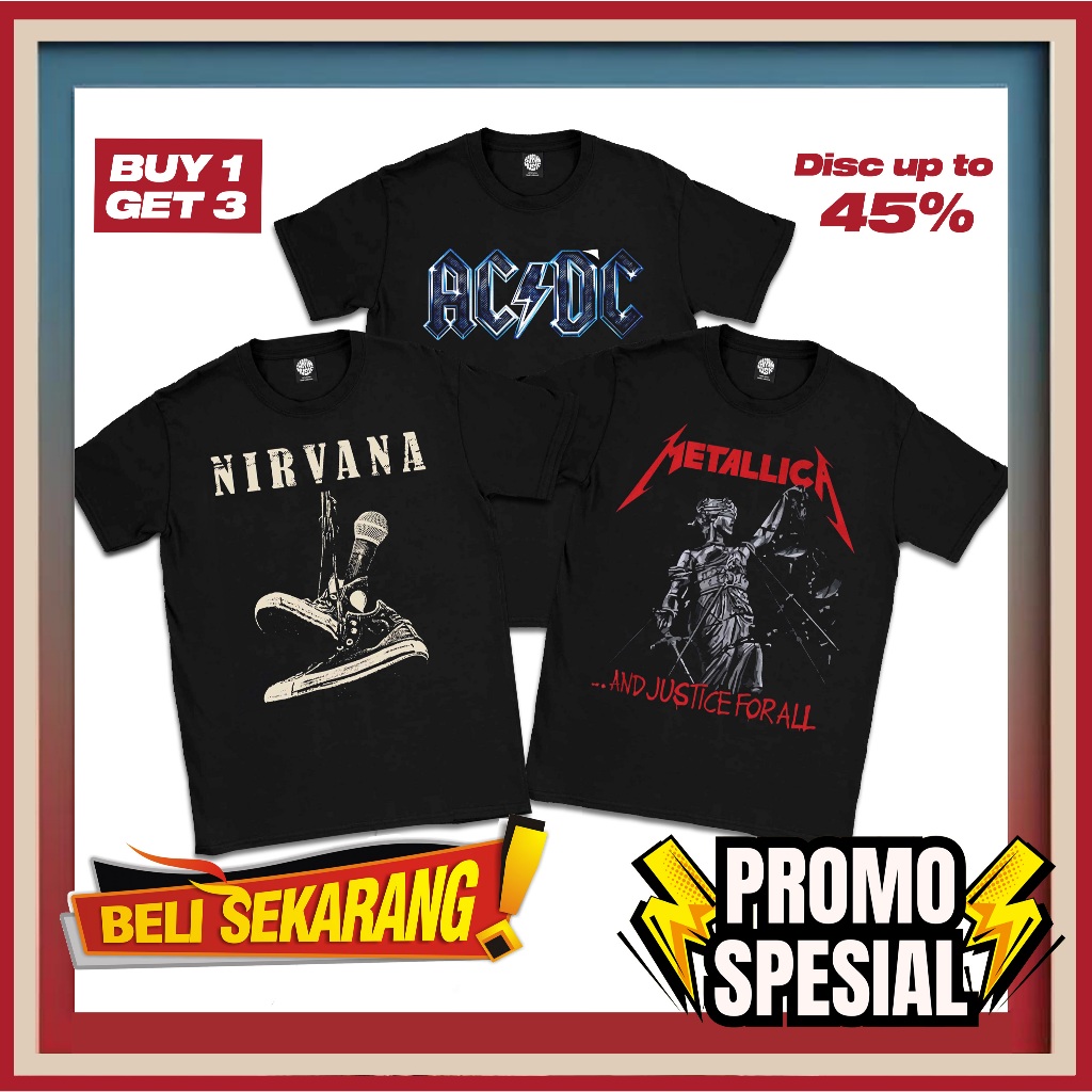 Beli 1 dapat 3 Kaos Distro Special bundling Nirvana Shoes & Mic ACDC Thunderbolt Metallica Justice For All Sablon Plastisol Bahan 100 persen Katun