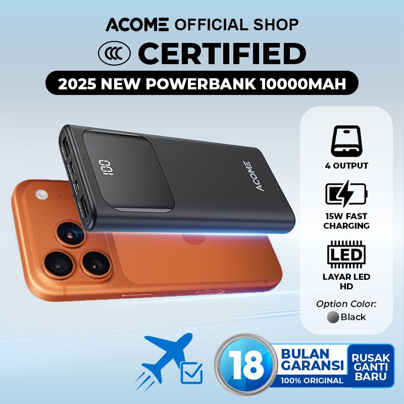 ACOME (Sertifikat CCC) Powerbank 10000mAh 4 Output Fast Charging 15W LED Display AP113 for iPhone Samsung Xiaomi Huawei Infinix 0P00 Realme